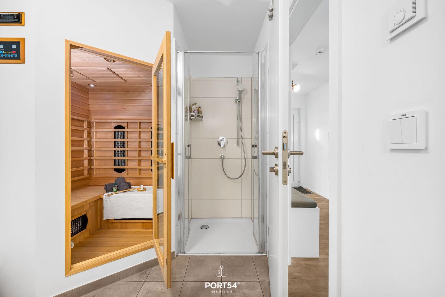 Das Badezimmer ist modern gestaltet und verfügt über Dusche mit Wanne, WC, Kosmetikspiegel und Haartrockner. Das Highlight ist hier die Whirlwanne und die eigene Infrarotkabine, die für Entspannung sorgen. Für besonderen Komfort sorgt zudem die Fußbodenheizung in der ganzen Unterkunft.