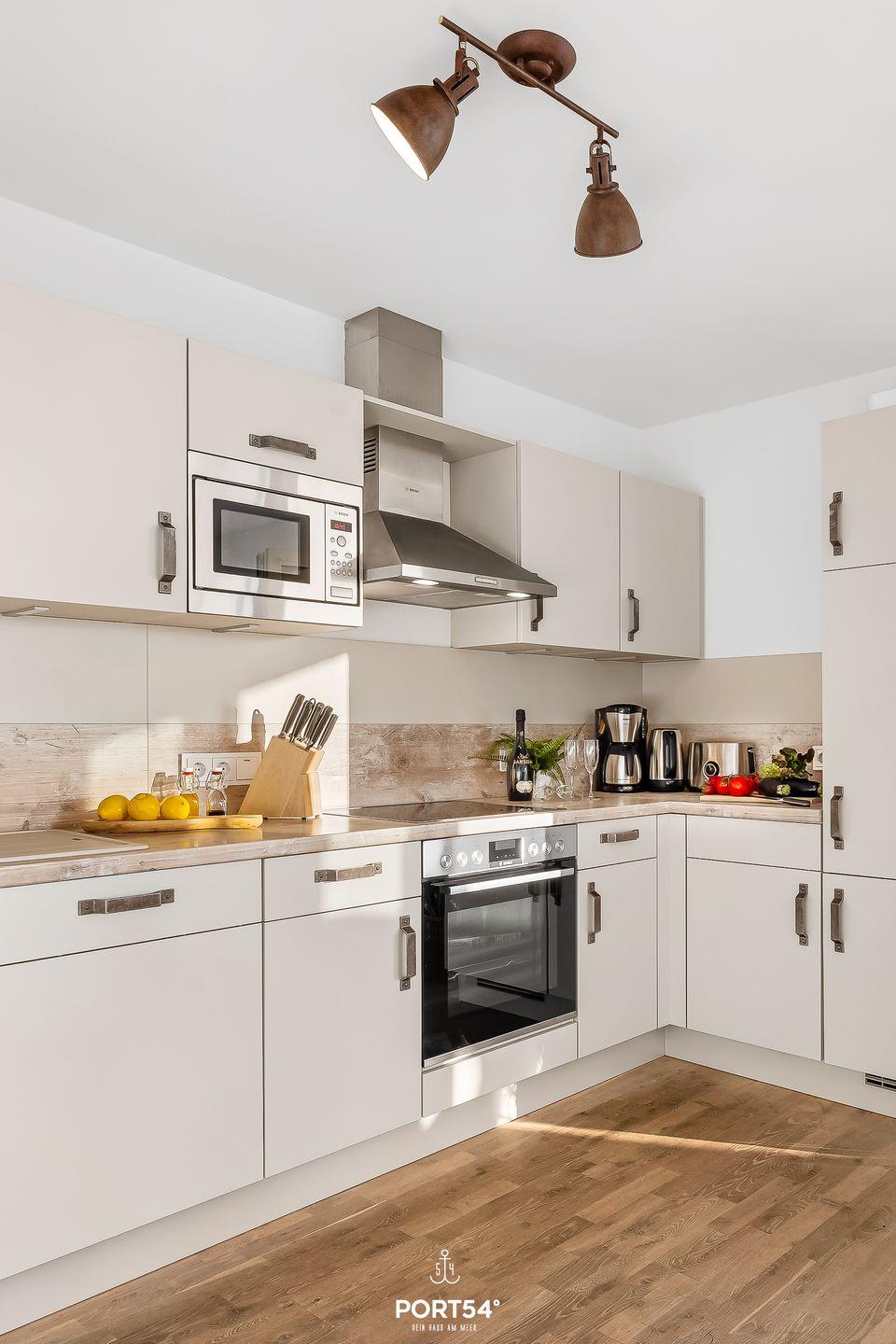 Das offene Wohnkonzept umfasst ein gemütliches Wohnzimmer mit Sofaecke, Fernseher, WLAN und Radio. Die voll ausgestattete Küche verfügt über einen Induktionsherd, Spülmaschine, Kühlschrank mit Gefrierfach, Kaffeemaschine sowie alle nötigen Küchenutensilien und Geschirr. Am angrenzenden Esstisch kannst Du gemeinsam essen und verweilen.