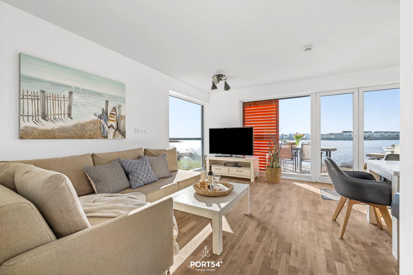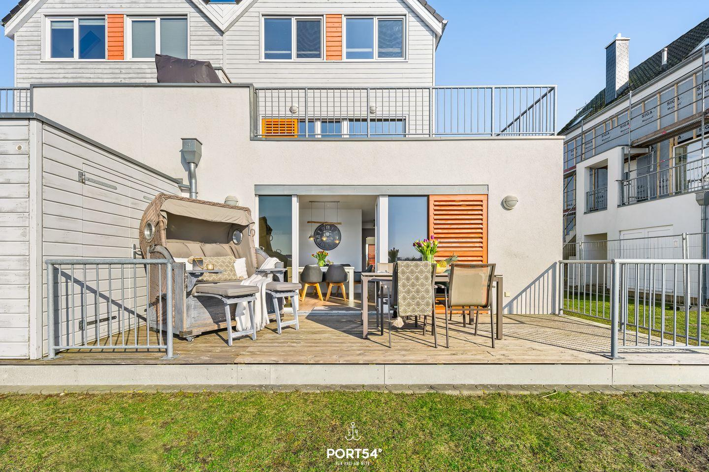 Die Ferienwohnung Landungsbrücke 22 in Olpenitz bietet modernen Komfort, Meerblick, Sauna und eine Terrasse direkt am Wasser.