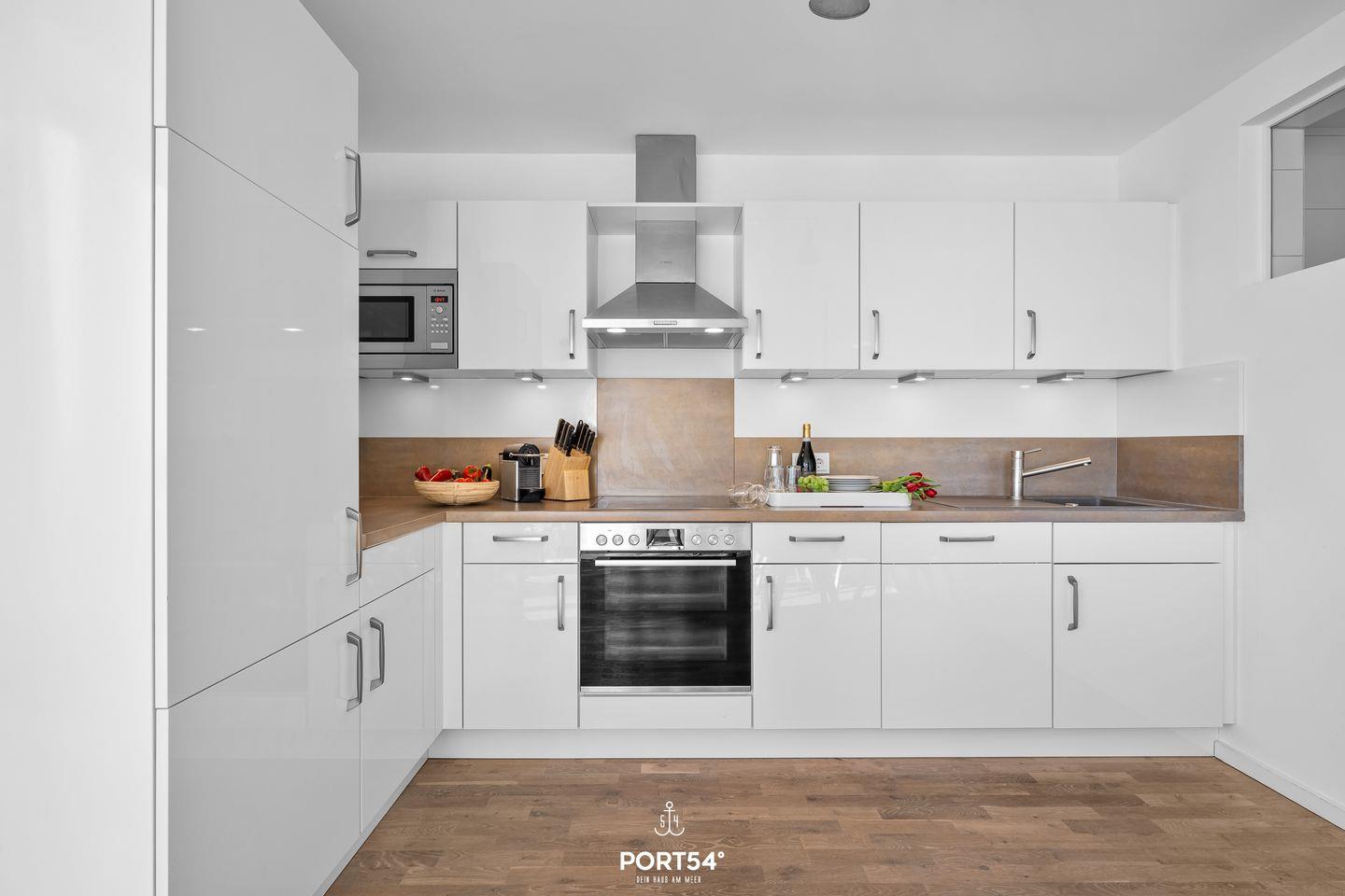 Die offene Küche ist komplett ausgestattet mit Induktionsherd, Geschirrspüler, Kaffeemaschine, Toaster und allen notwendigen Küchenutensilien – ideal für gemeinsame Mahlzeiten.