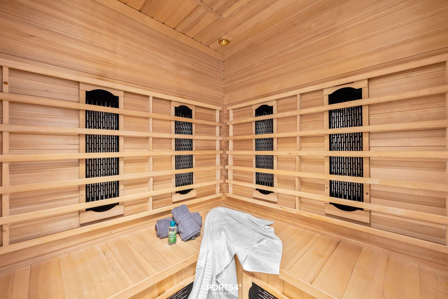 Das moderne Badezimmer verfügt über eine Whirlwanne, Kosmetikspiegel, Haartrockner und Fußbodenheizung. Für Wellness und Entspannung steht Dir hier ebenfalls eine eigene Infrarotsauna bereit. Die Wohnung überzeugt durch hochwertige Ausstattung und ein modernes, wohnliches Ambiente.