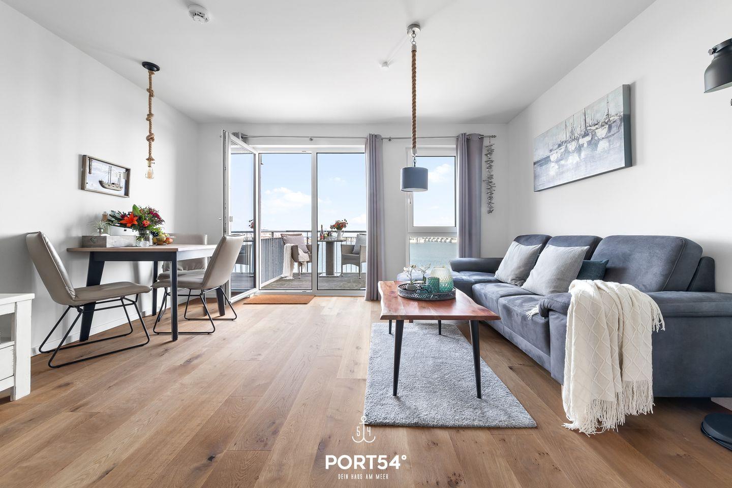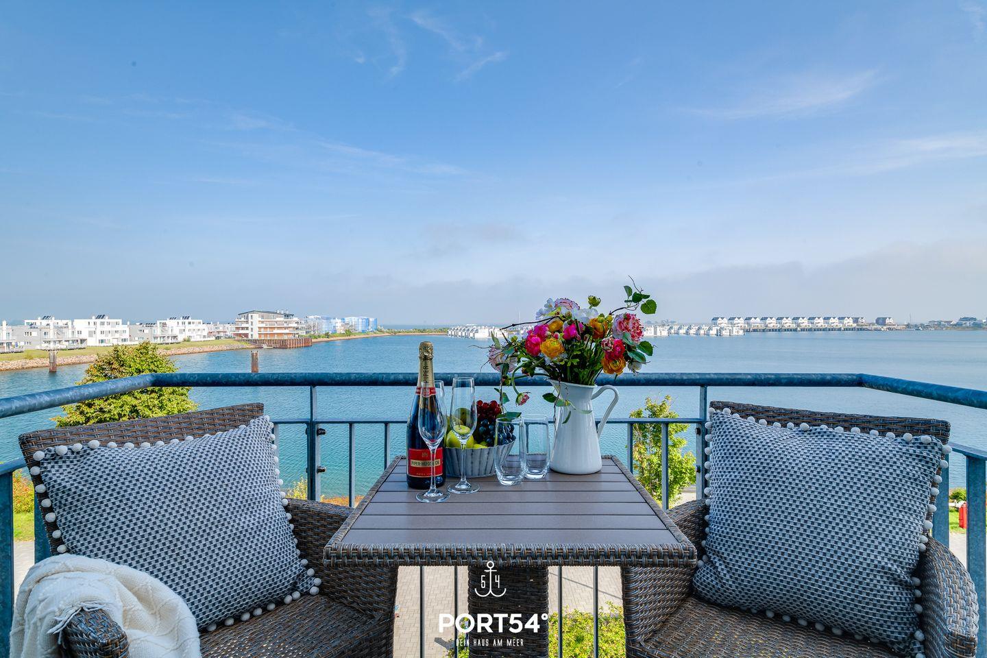 Die Ferienwohnung "Cannes" in Olpenitz bietet modernen Komfort, Balkon mit Hafenblick und einen privaten Stellplatz.