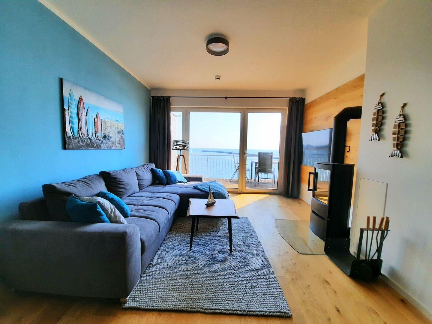 Das Herzstück der Wohnung ist der offen gestaltete Wohn- und Essbereich, der mit seinem eleganten Design und dem Kaminofen für ein behagliches Raumgefühl sorgt. Große Fenster lassen viel Tageslicht in den Raum und bieten Dir einen tollen Meerblick, der zu jeder Tageszeit für ein besonderes Wohlfühlerlebnis sorgt. Für Unterhaltung sorgen hier der Smart-TV, Spiele und WLAN in der gesamten Unterkunft.