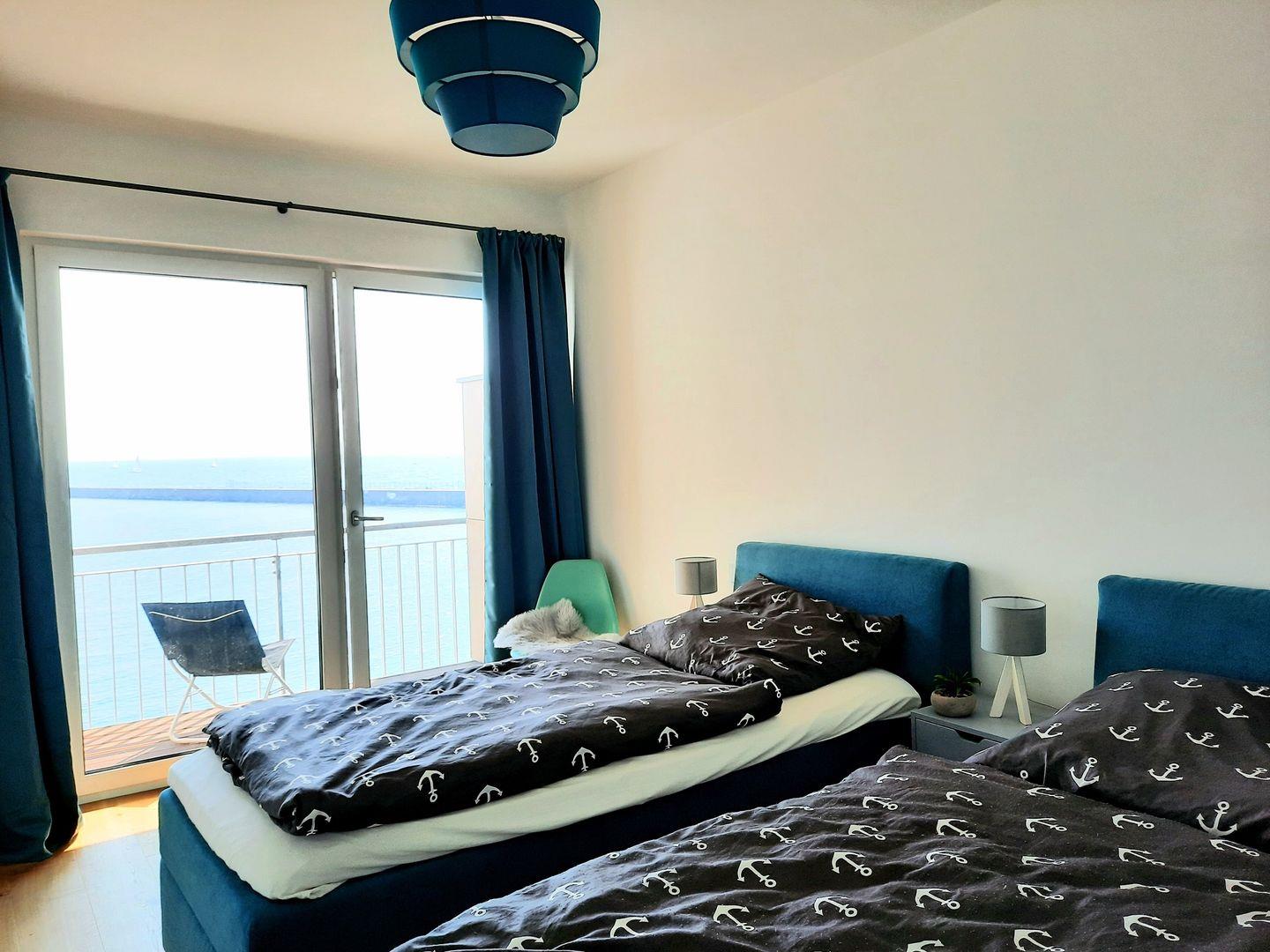 Die Wohnung verfügt über zwei separate Schlafzimmer. In einem der Schlafzimmer findest Du ein Doppel-Boxspringbett (200x200 cm), in dem anderen zwei Einzelbetten (100x200 cm). Beide Schlafzimmer verfügen über einen Kleiderschrank, Verdunkelungsmöglichkeiten und je einen Smart-TV. Hier kommst Du in den Genuss von viel Privatsphäre und individuell gestaltetem Schlafkomfort. Der fünfte Schlafplatz befindet sich auf dem gemütlichen Sofa im Wohnbereich. Für die jüngsten Gäste stehen sowohl ein Babybett als auch ein Kinderhochstuhl zur Verfügung.