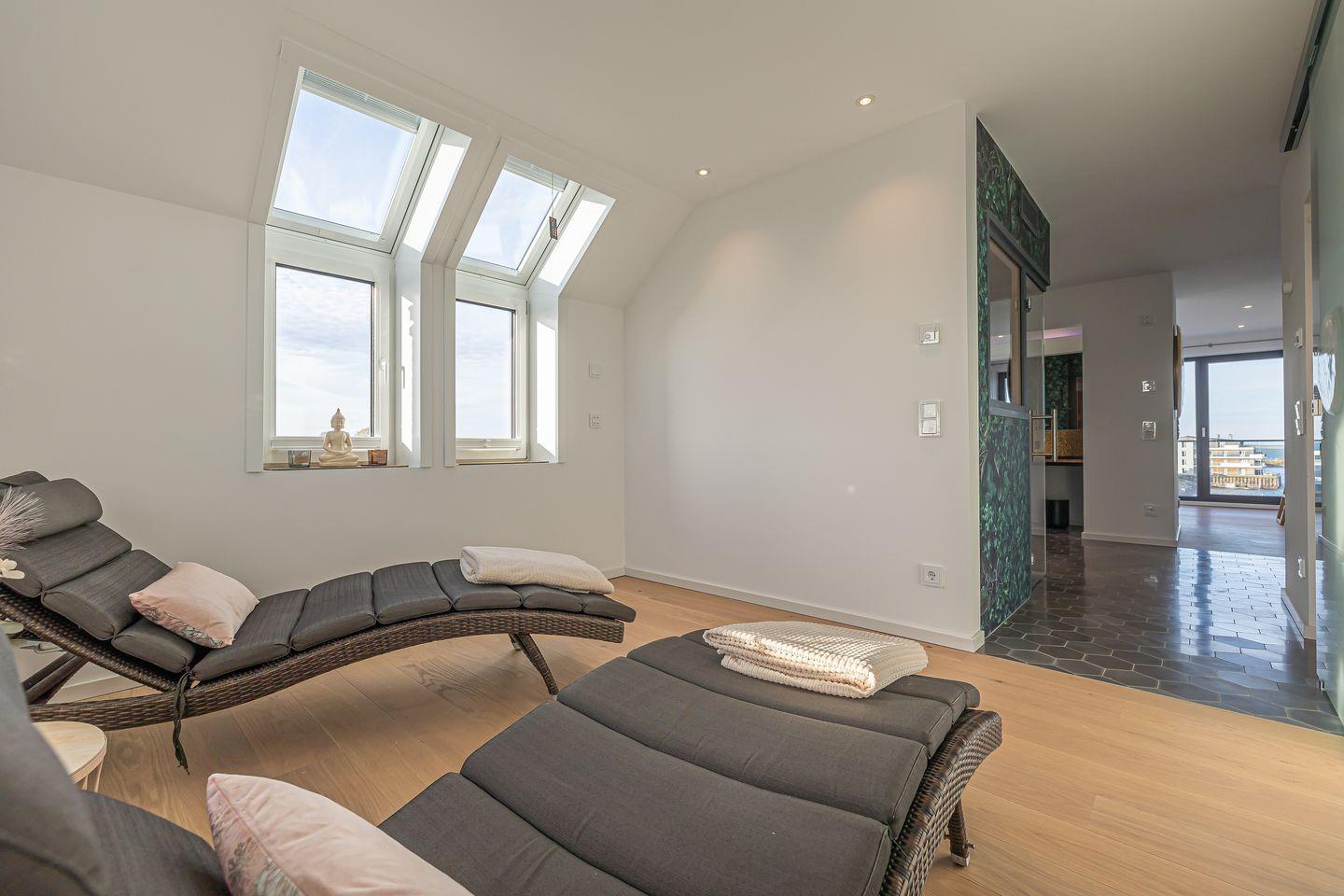 Ebenfalls vom Badezimmer abgehend befindet sich ein Ruheraum mit zwei Sonnenliegen, in dem Du vollkommen entspannen kannst.