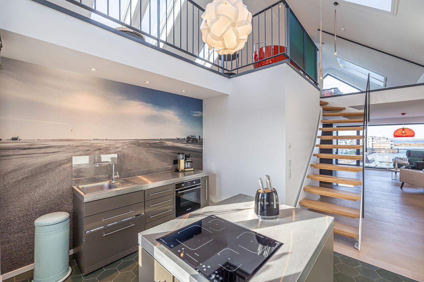 Die moderne Küche ist zum Wohnzimmer hin offen gehalten und überzeugt durch eine umfassende Ausstattung: Neben einem Induktionsherd (2 Platten), Toaster und Spülmaschine findest Du hier auch eine Espresso- und eine Kaffeemaschine, einen Sandwichmaker, Mixer und Pürierstab sowie sämtliche Küchenutensilien, Geschirr und Besteck für ein komfortables Kocherlebnis.