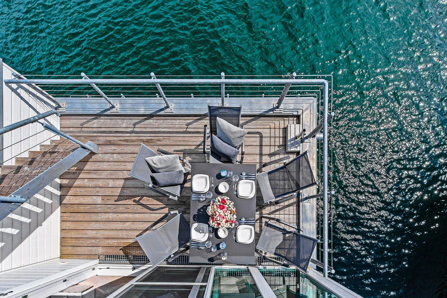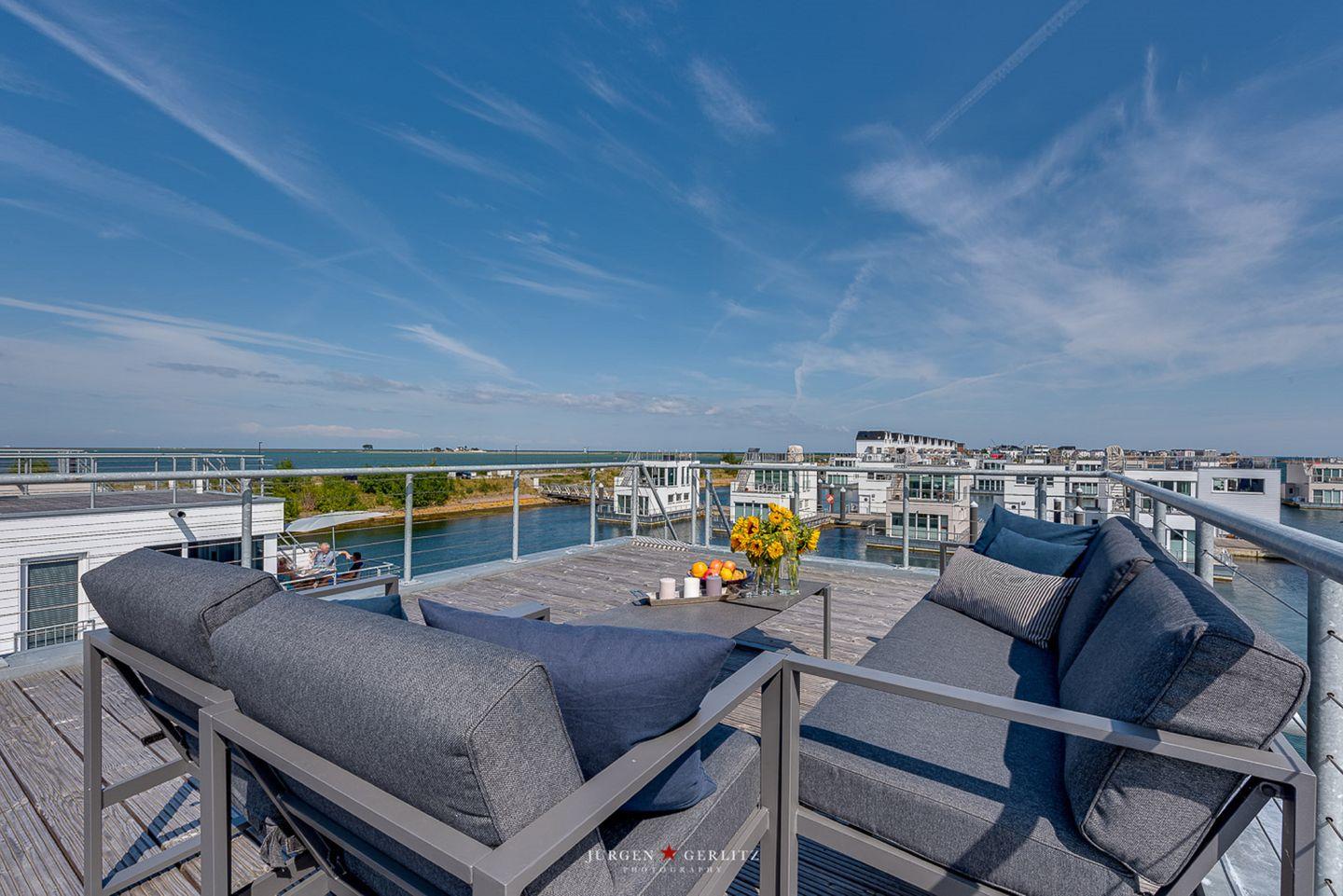 Das schwimmende Ferienhaus „Moin Moin“ in Olpenitz bietet Meerblick, Sauna, Dachterrasse und Komfort auf 97 m².