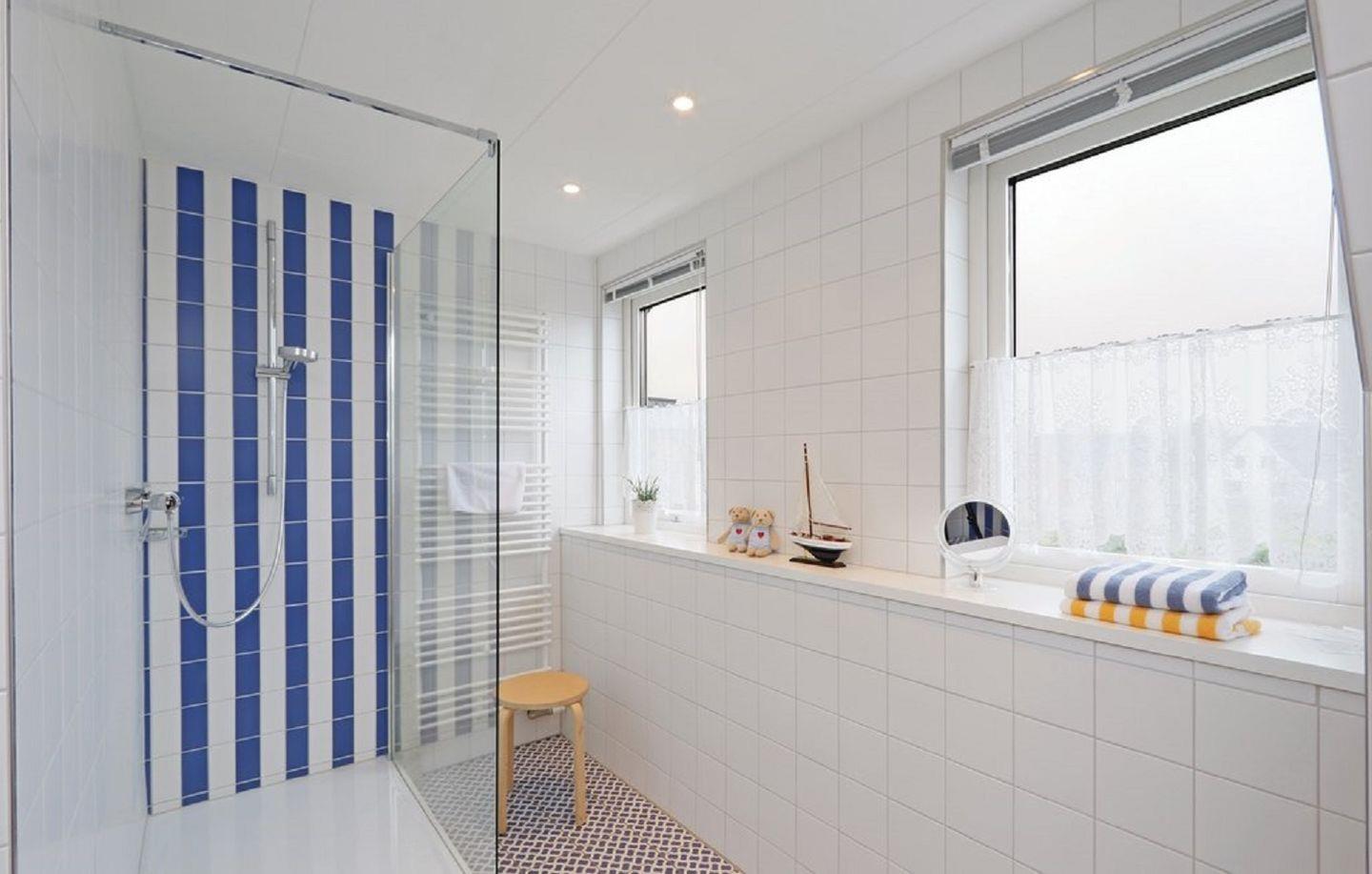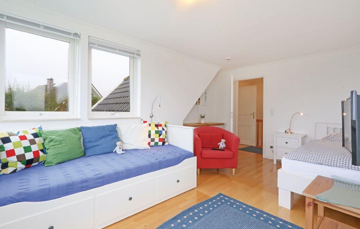 Im Obergeschoss erwarten Dich drei komfortable Schlafzimmer. Das erste Schlafzimmer ist mit einem gemütlichen Doppelbett (180x200 cm) und einem praktischen Einbauschrank ausgestattet. Das zweite Schlafzimmer verfügt über ein großzügiges Doppelbett (200x200 cm) sowie ebenfalls einen Einbauschrank. Im dritten Schlafzimmer stehen Dir eine Kommode und zwei Einzelbetten (90x200 cm und 100x200 cm) zur Verfügung, die sich ideal für Kinder oder weitere Gäste eignen. Zusätzlich befindet sich im Obergeschoss ein modernes Bad mit Fenster, ebenerdiger Dusche, WC und Handtuchheizung, das Dir Komfort und Bequemlichkeit bietet. Für Familien steht Dir ein Kinderreisebett zur Verfügung, sodass auch die Kleinsten einen erholsamen Schlaf genießen können.