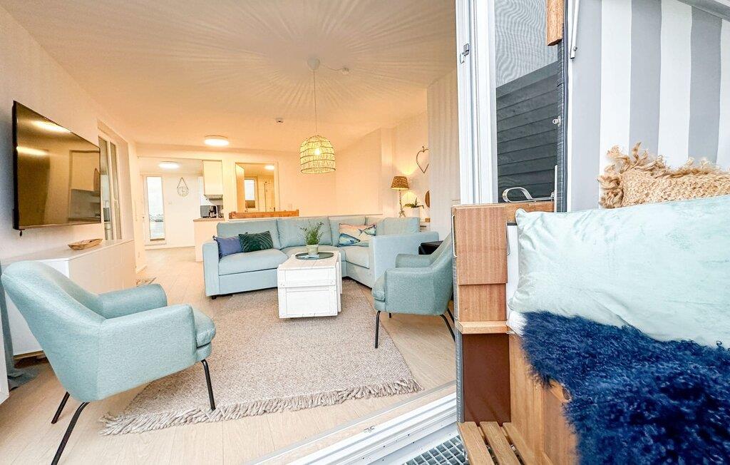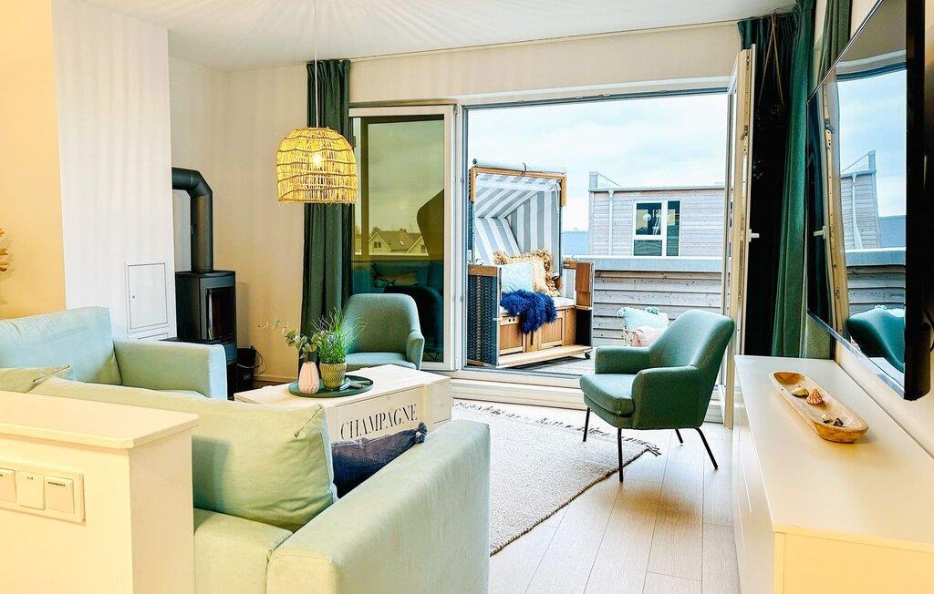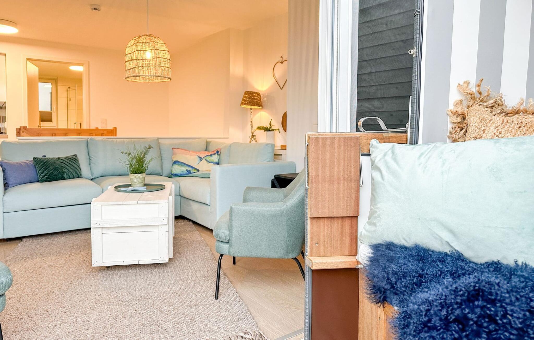 Im zweiten Obergeschoss angekommen, werdet ihr von der bodentiefen Fensterfront mit der angrenzenden Terrasse empfangen. Tretet ein und fühlt euch wie Zuhause. Auf der Wohnlandschaft mit Kuschelfaktor zu entspannen, aus dem Fenster den Blick auf den Hafen genießen oder fernsehen ist Entspannung und Erholung pur! Der Alltag entrückt immer mehr... Sollte das Wetter sich einmal von der nordischen Seite zeigen, sorgt der Kaminofen mit seinem prasselnden Feuer für weitere Behaglichkeit. Auf dem Schlafsofa finden zwei weitere Personen Platz zum Schlafen.