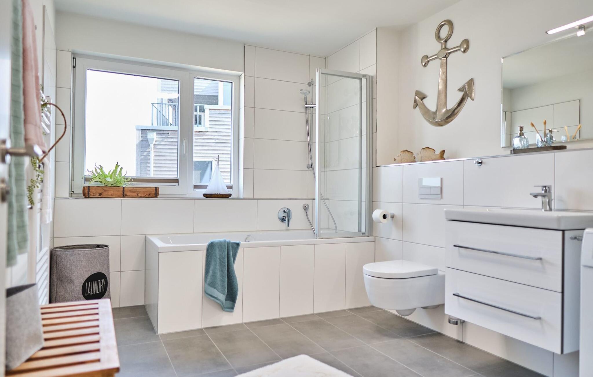 Auf dieser Etage befindet sich zudem ein bestens ausgestattetes Badezimmer mit Badewanne.