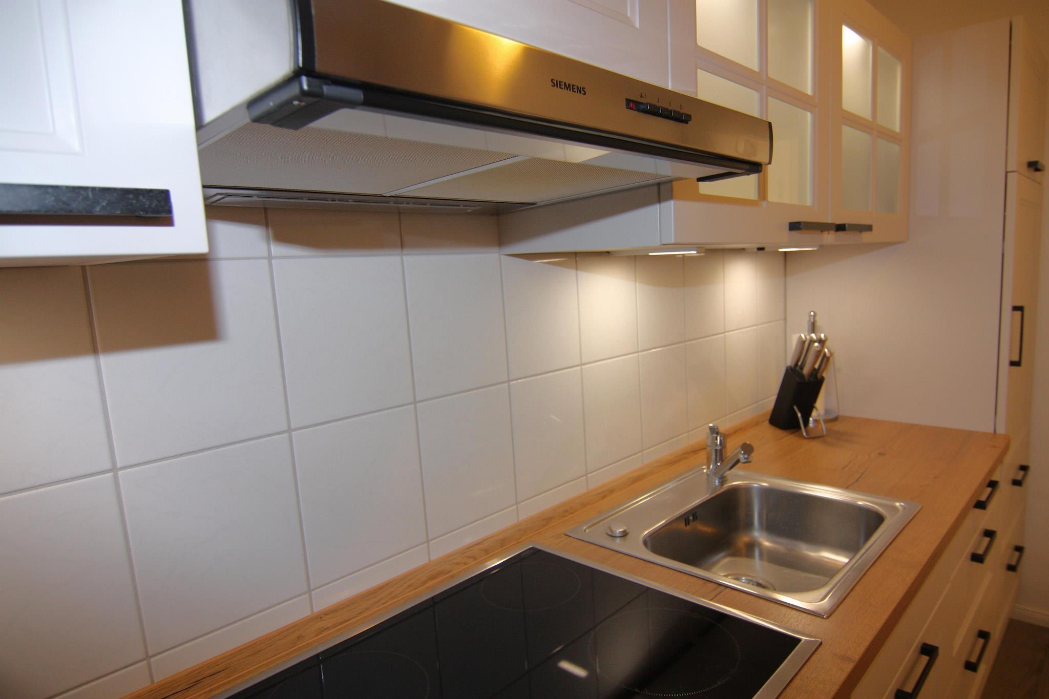 In der 1. Etage: (offene Küche(Kochplatte(4 Kochplatten, Ceranfeld), Wasserkocher, Toaster, Dunstabzugshaube, Kaffeemaschine, Backofen, Spülmaschine, Kühlschrank(+ Gefrierfach)), Wohn/Esszimmer(Doppelschlafcouch, TV(Kabel), Esstisch(4 Personen), Radio), Schlafzimmer(Doppelbett(180 x 200 cm)), Badezimmer(Dusche, Waschbecken, Toilette)) Garage(auf dem Gelände), Trockner(Gemeinschaftliche Nutzung mit anderen Gästen, gegen Gebühr), Waschmaschine(Gemeinschaftliche Nutzung mit anderen Gästen, gegen Gebühr), Heizung, Hochstuhl, Babybett (kostenlos), Handtücher/Bettwäsche (extra Gebühr)