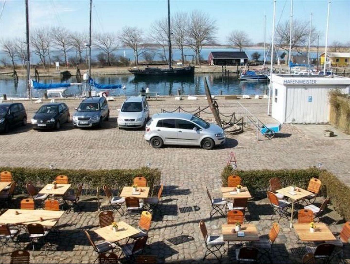 Im unteren Bereich der Ferienanlage befindet sich ein gemütliches Café. Dort gibt es leckere Brötchen, Torten und Kuchen. Sofern man gerne das Frühstück im Strandkorb genießen will, kann man dort bereits am Morgen das Hafentreiben beobachten.