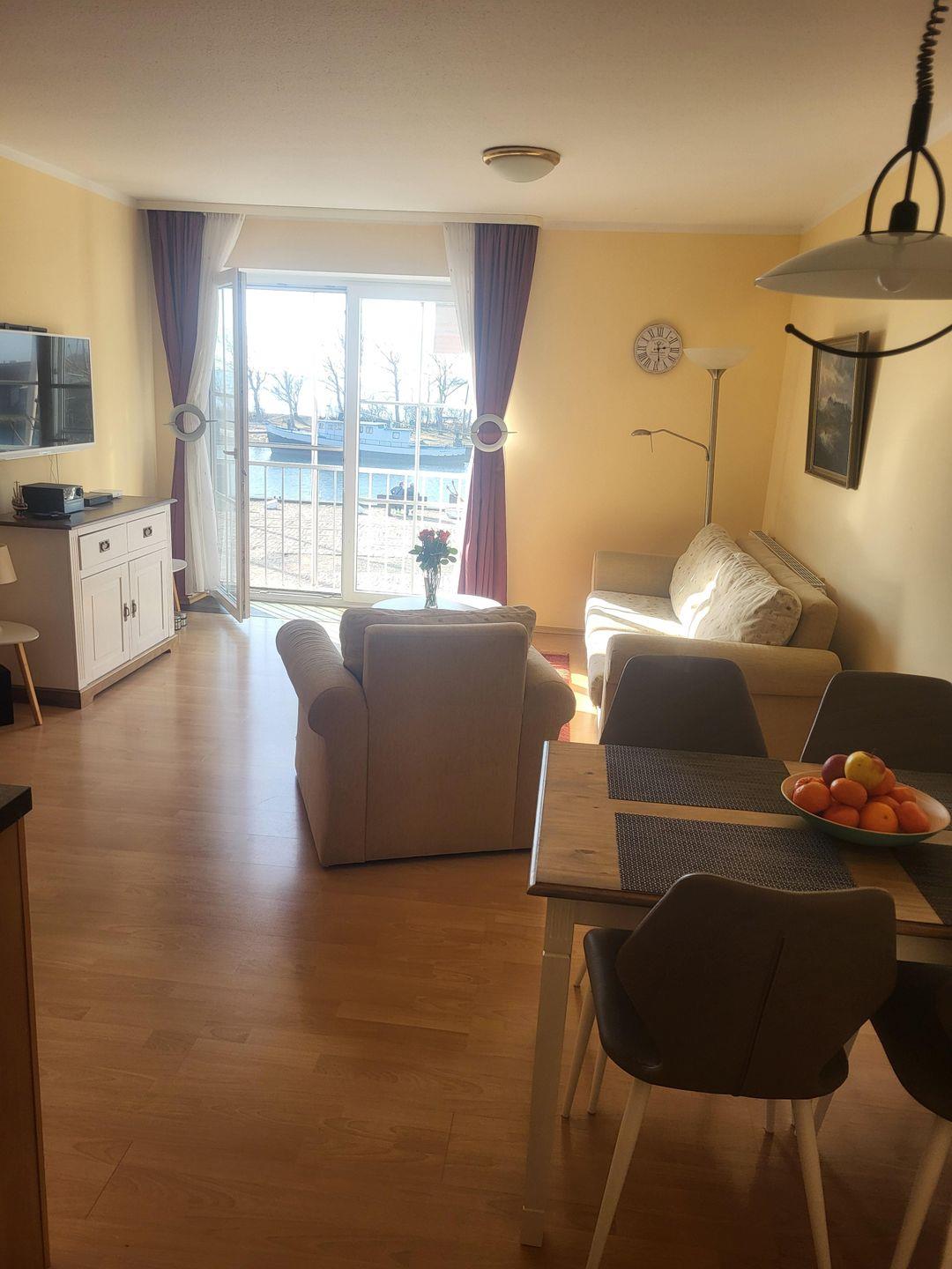 Die komfortable Ferienwohnung liegt im 1. Obergeschoss der Appartmentanlage im idyllischen Yachthafen Orth auf Fehmarn. Orth ist von 3 Seiten von Wasser umgeben und bietet ideale Bade- und Surf-/ Segelmöglichkeiten. Die Ferienwohnung hat ein Wohn-Esszimmer mit Blick in den Hafen, eine geräumige Küche mit Backofen, 4-Platten-Kochfeld, Kühlschrank mit Gefrierfach, Mikrowelle sowie Geschirrspüler. Ein französischer Balkon mit Blick in den Hafen grenzt an das Wohnzimmer. Ein separates Schlafzimmer mit Doppelbett ist vorhanden, ebenso ein geräumiges Duschbad. Flachbildfernseher sowie DVD-Player gehören ebenfalls zur gehobenen Ausstattung. Die gesamte Wohnung ist gefliest bzw. mit Laminat ausgelegt. Kinderreisebett und Kinderhochstuhl gehören ebenfalls zur Ausstattung.