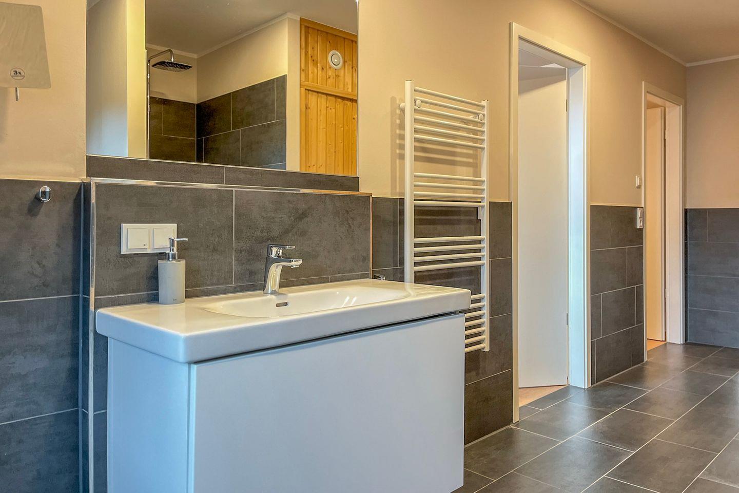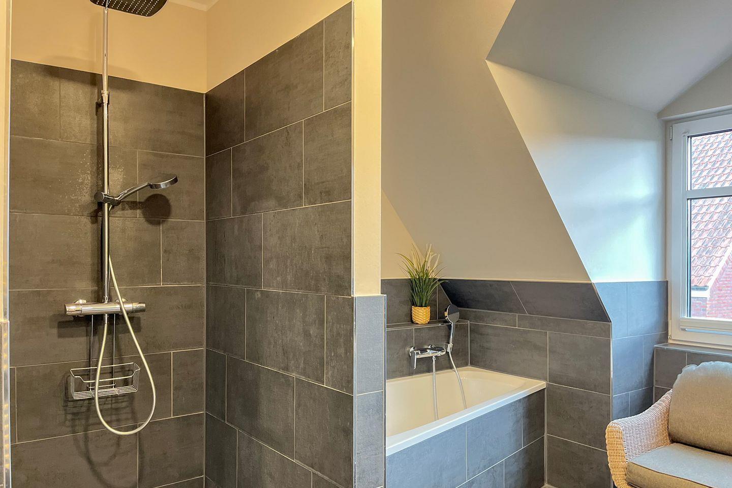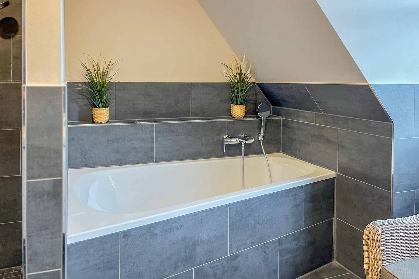 Das Badezimmer überzeugt mit einer bodengleichen Dusche, WC, Waschbecken, Kosmetikspiegel, Haartrockner sowie einer Badewanne für besondere Wohlfühlmomente.