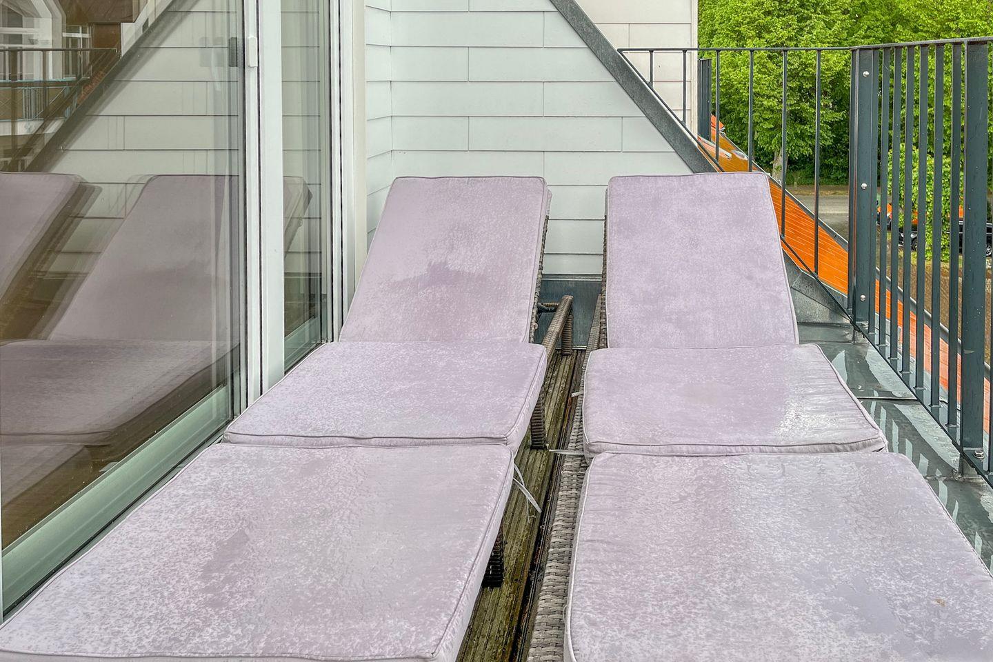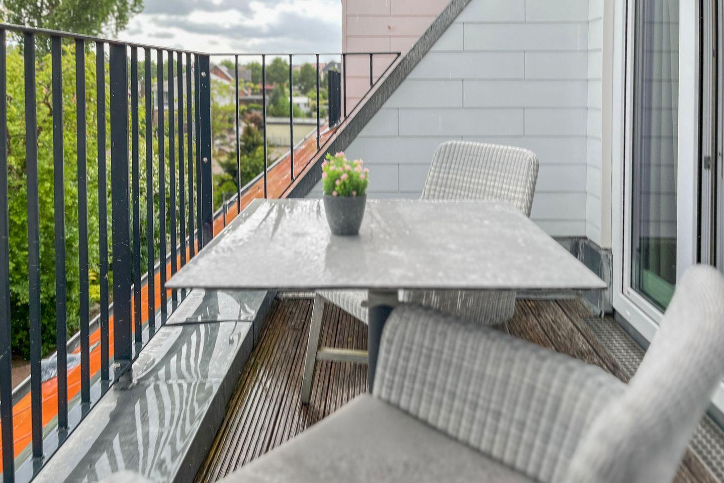 Der möblierte Balkon mit Sonnenschirm und Sonnenliegen lädt zu Frühstück, Lesen oder einfach zum Durchatmen ein – ein angenehmer Rückzugsort an der frischen Luft.