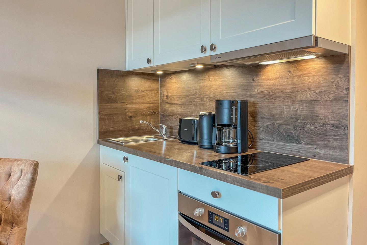 Die offen gestaltete Küche ist hervorragend ausgestattet: Cerankochfeld, Backofen, Kühlschrank mit Gefrierfach, Kaffeemaschine, Wasserkocher, Toaster sowie Kochutensilien und Geschirr lassen keine Wünsche offen.