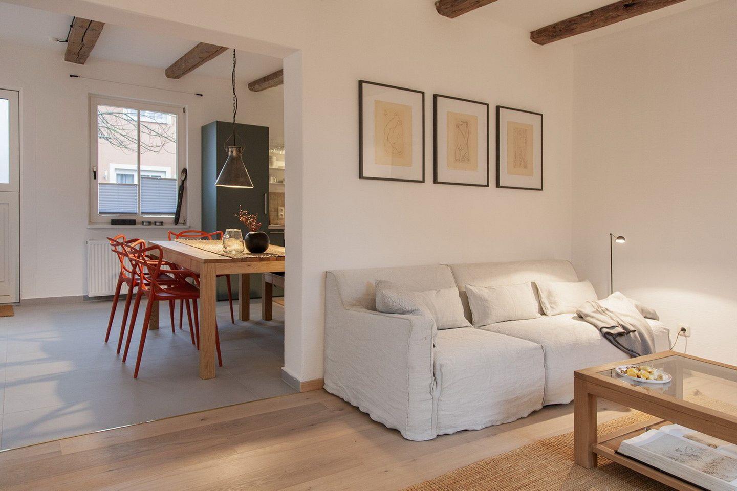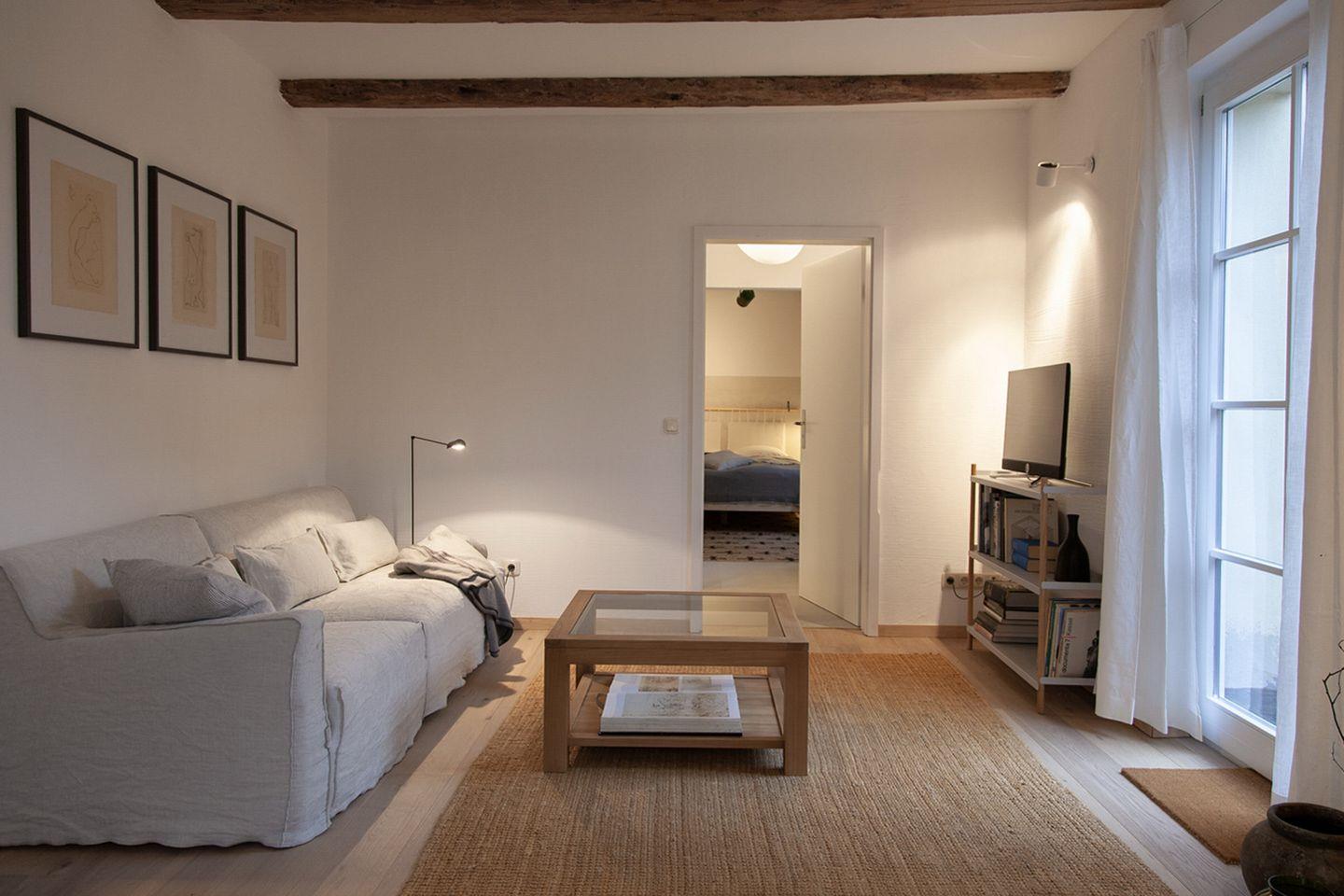Der Wohnbereich lädt mit einer gemütlichen Couch und einem Flat-TV von Loewe zu entspannten Abenden ein. Es gibt eine kleine Ecke zum Zeichnen (mit Staffelei, Zeichenstiften, Kreiden und Aquarellfarben). Es stehen dir einige Bücher und kostenfreies W-LAN (ohne Gewähr) zur Verfügung. Angrenzend zum Wohnzimmer befindet sich eine kleine Außenterrasse.