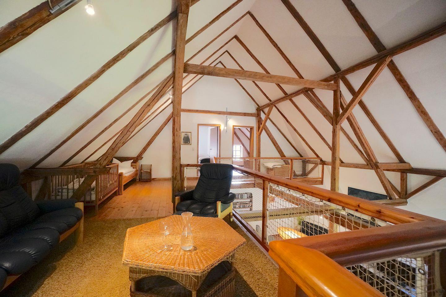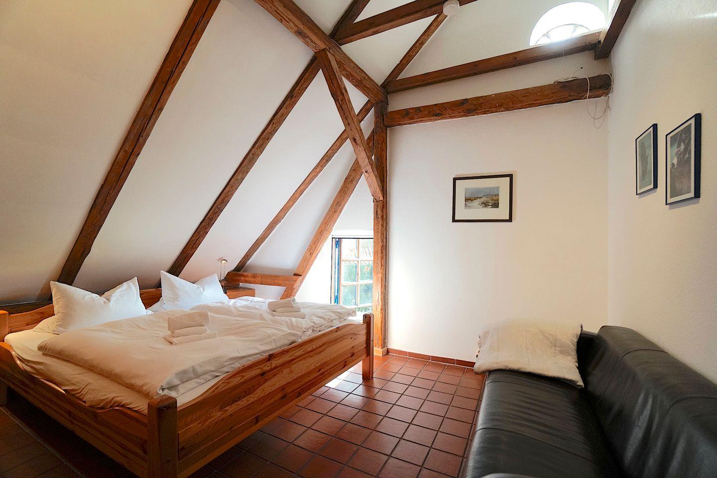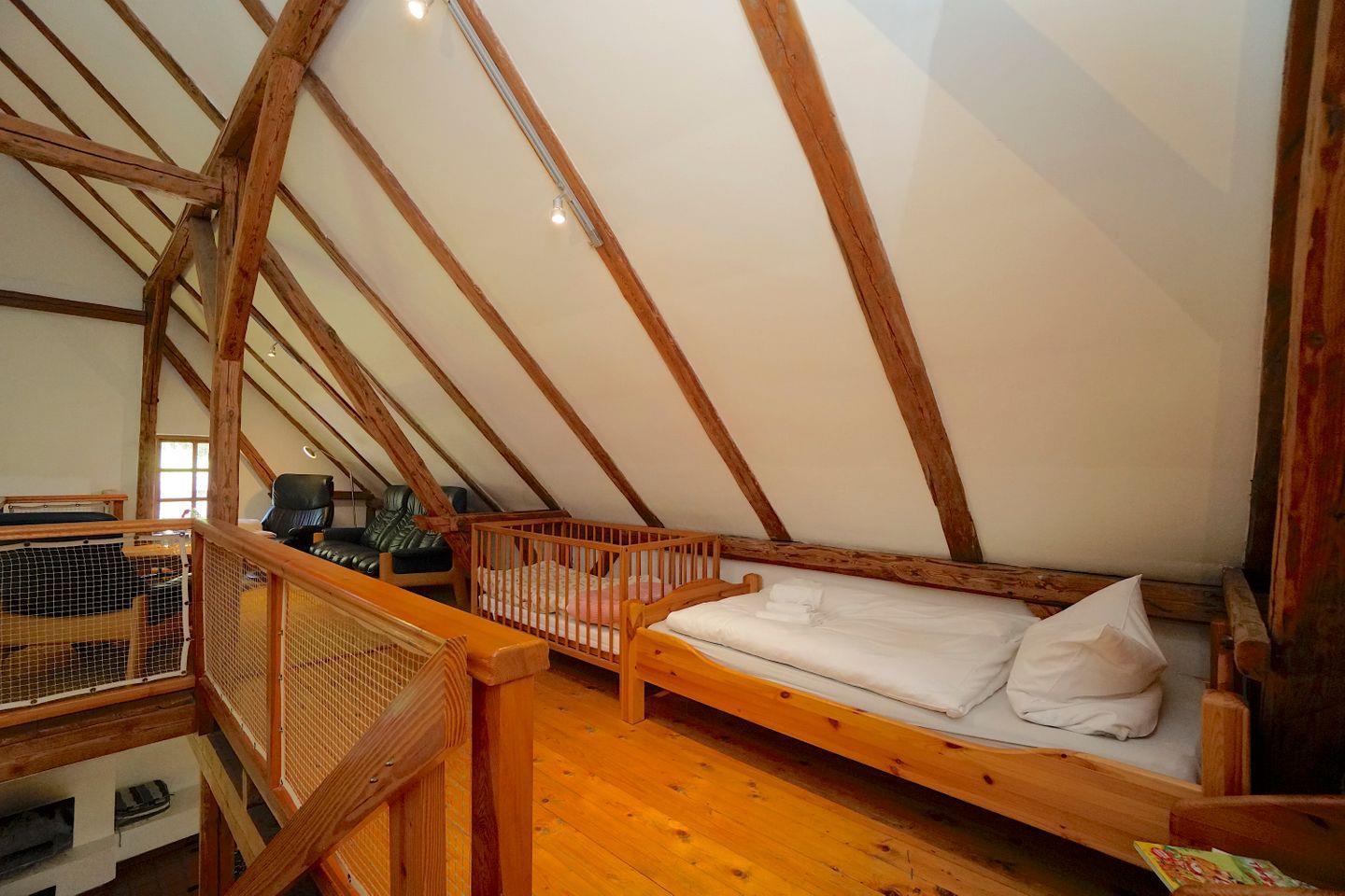 Im Obergeschoss hält die Galerie einen weiteren kleinen Ruhe/Sofabereich vor und zwei der drei Schlafzimmer befinden sich dort. Diese sind liebevoll und nachhaltig eingerichtet und bieten sich optimal an für einen erholsamen Schlaf.