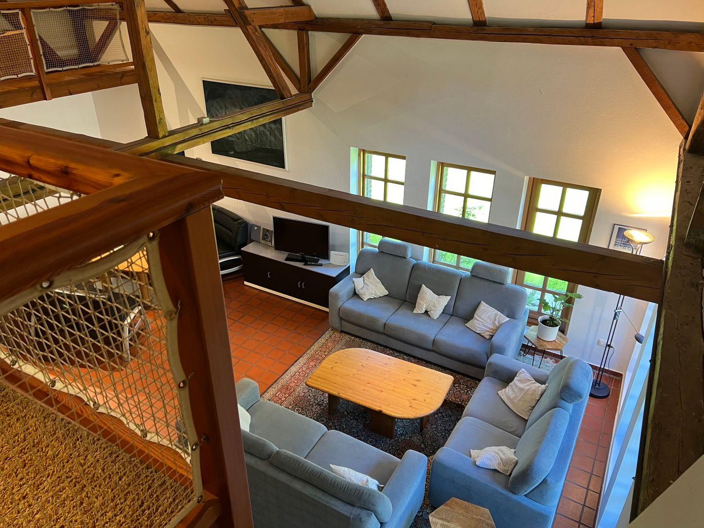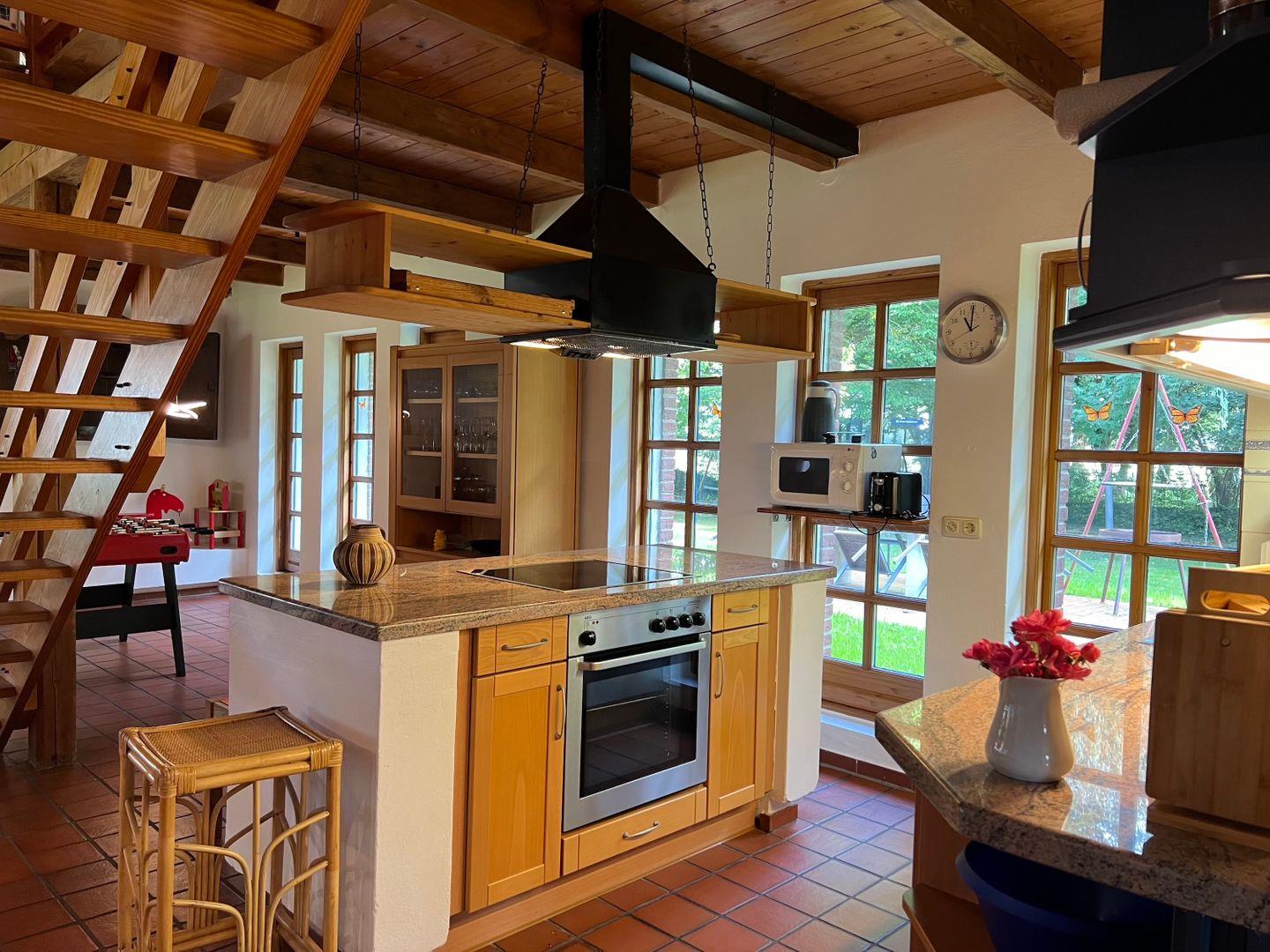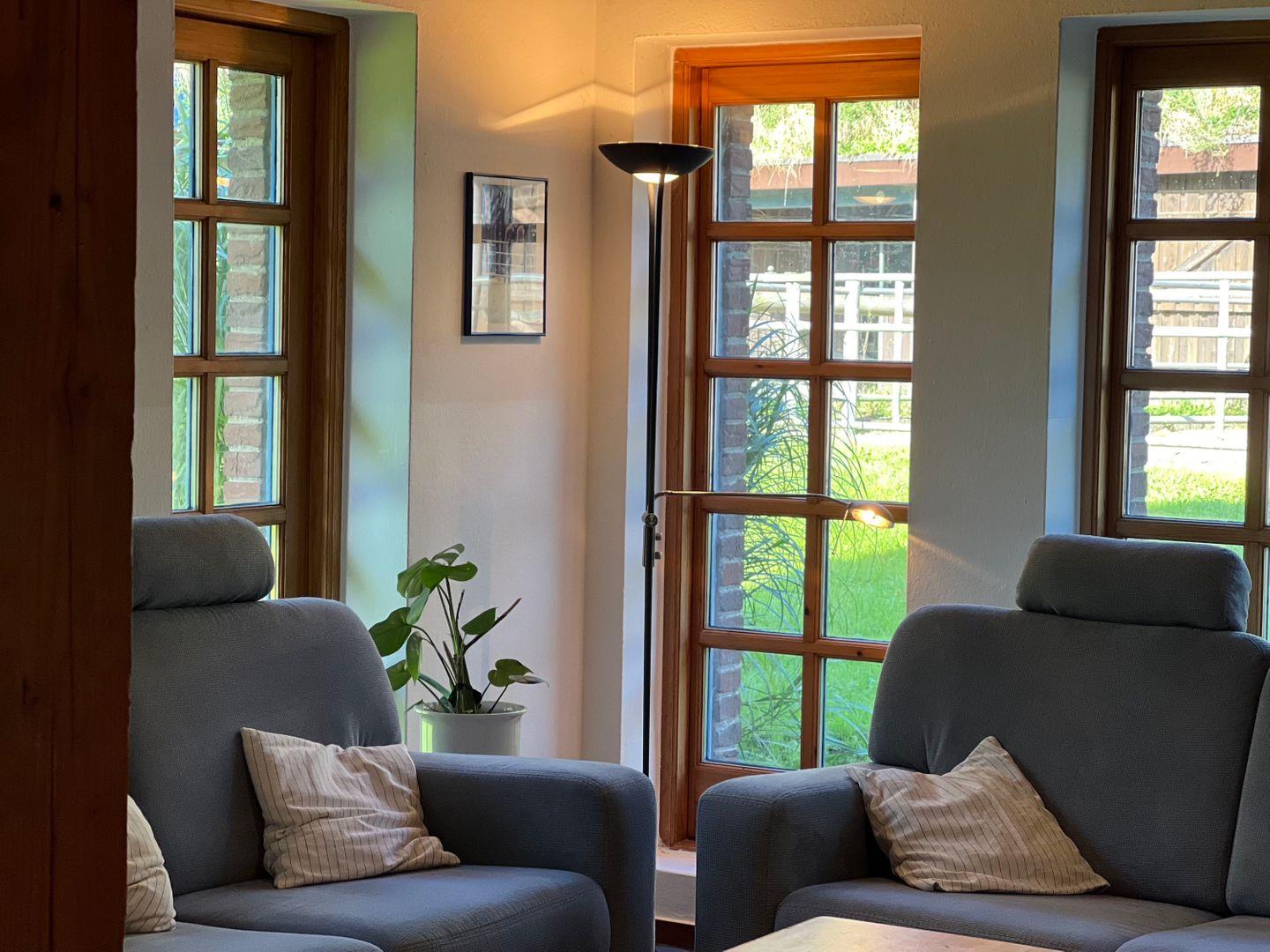 Im Untergeschoss des Hauses befindet sich der gesellige und große Gemeinschaftsraum, bestehend aus Essbereich, Küche, Wohnzimmer und Tischkicker-Ecke. Die zahlreichen bodentiefen Fenster lassen viel Licht in den Raum und erfreuen mit dem Blick auf die süßen Islandpferde und die andern Tiere des Hofes.