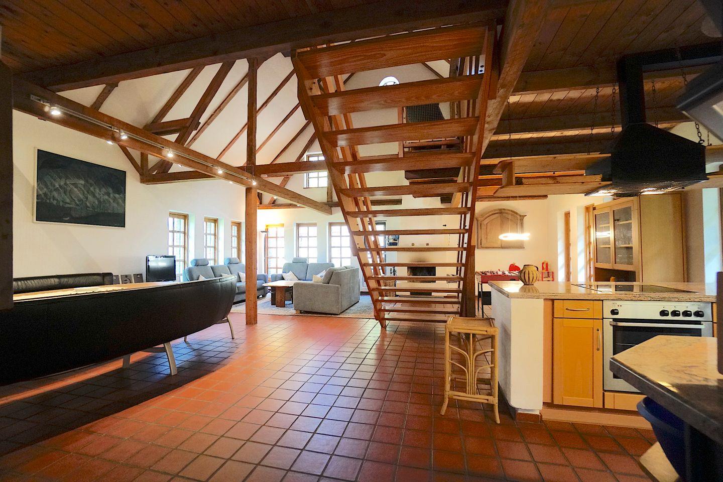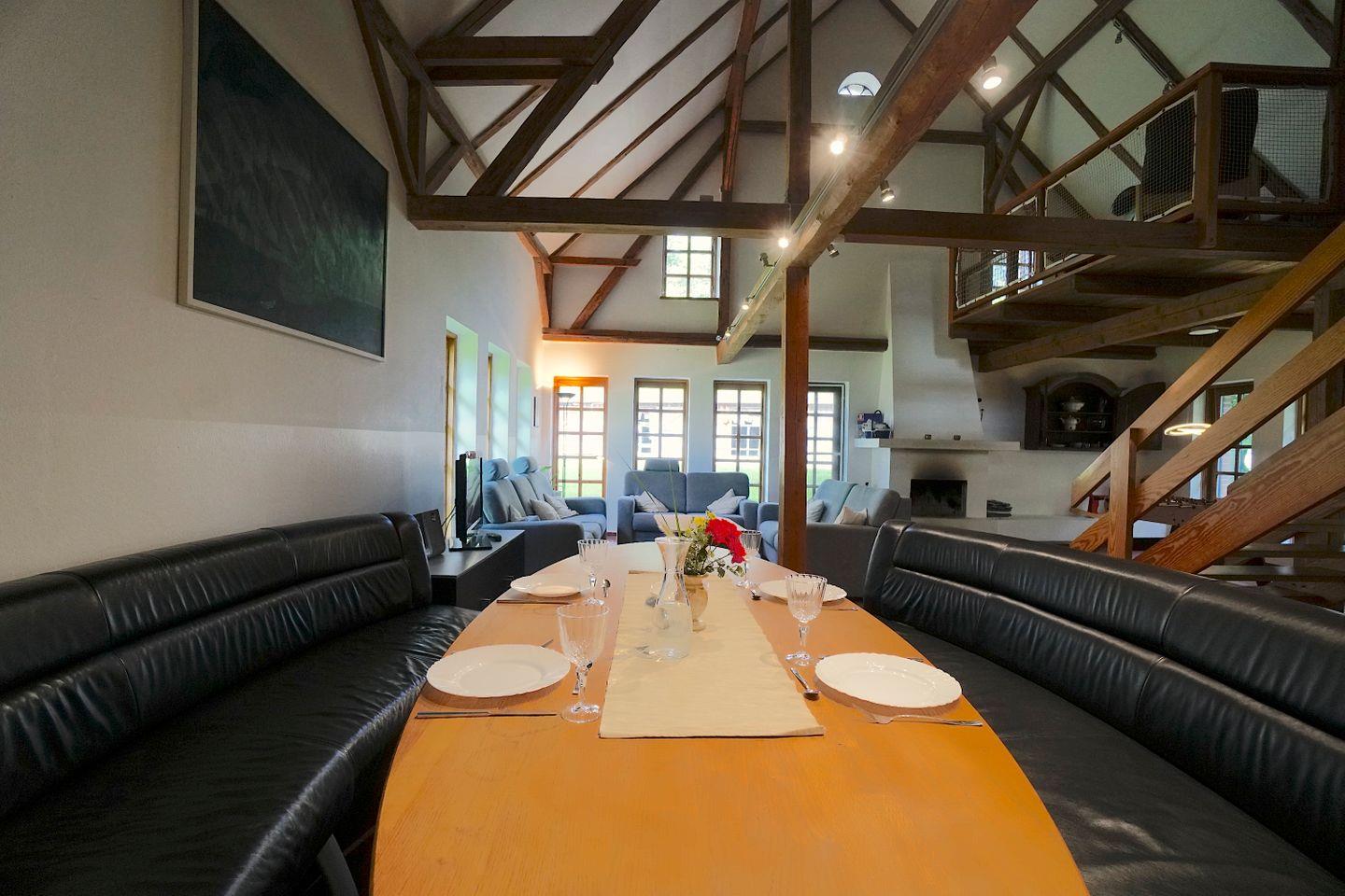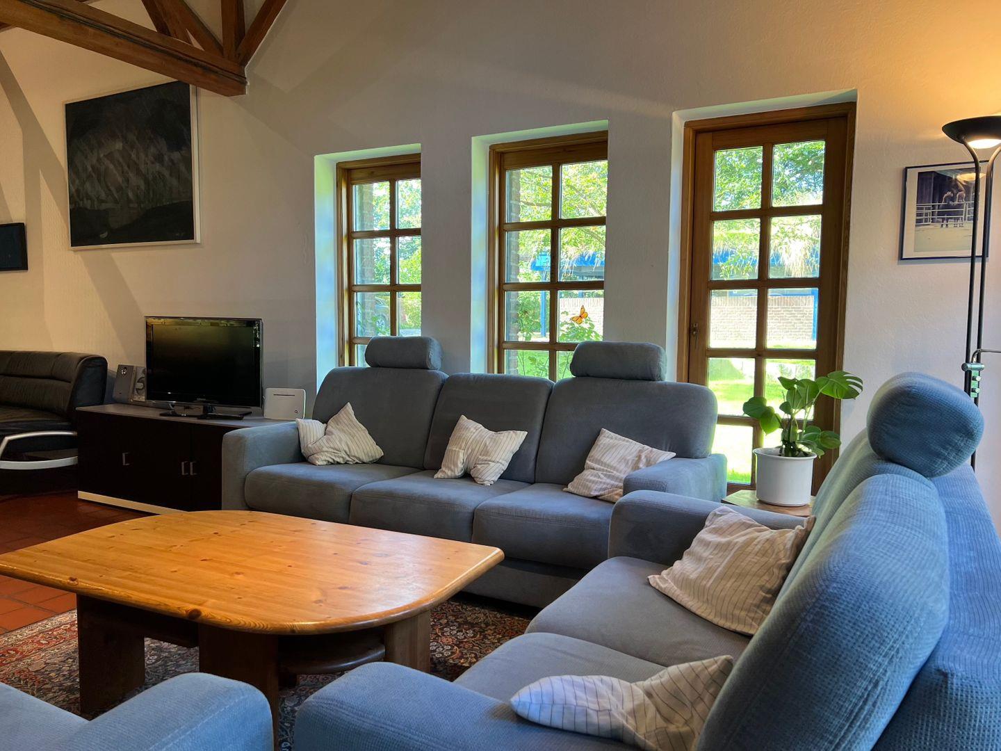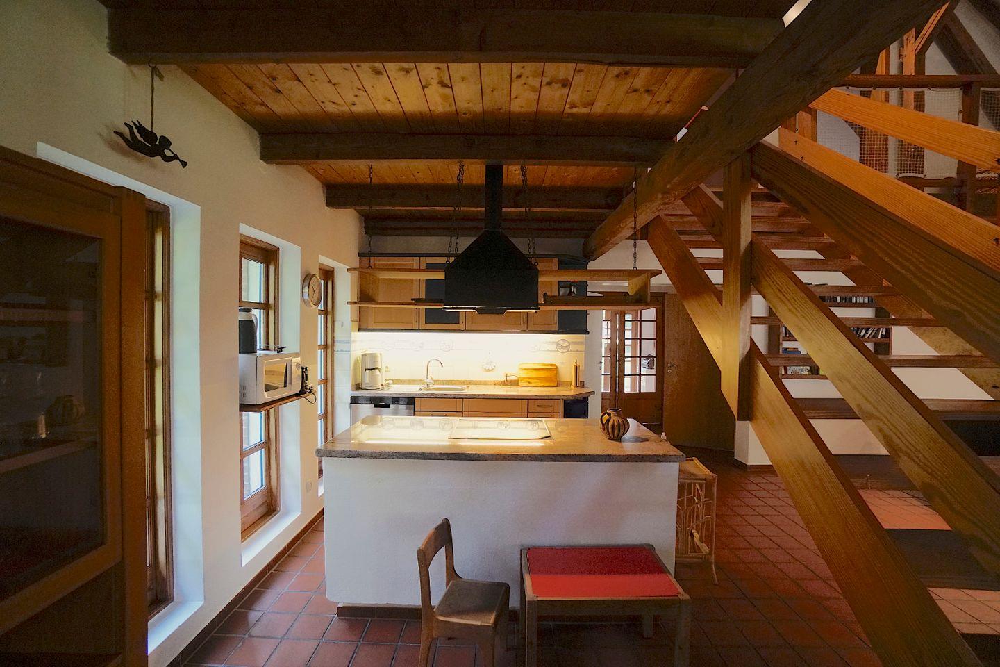 Im Untergeschoss des Hauses befindet sich der gesellige und große Gemeinschaftsraum, bestehend aus Essbereich, Küche, Wohnzimmer und Tischkicker-Ecke. Die zahlreichen bodentiefen Fenster lassen viel Licht in den Raum und erfreuen mit dem Blick auf die süßen Islandpferde und die andern Tiere des Hofes.