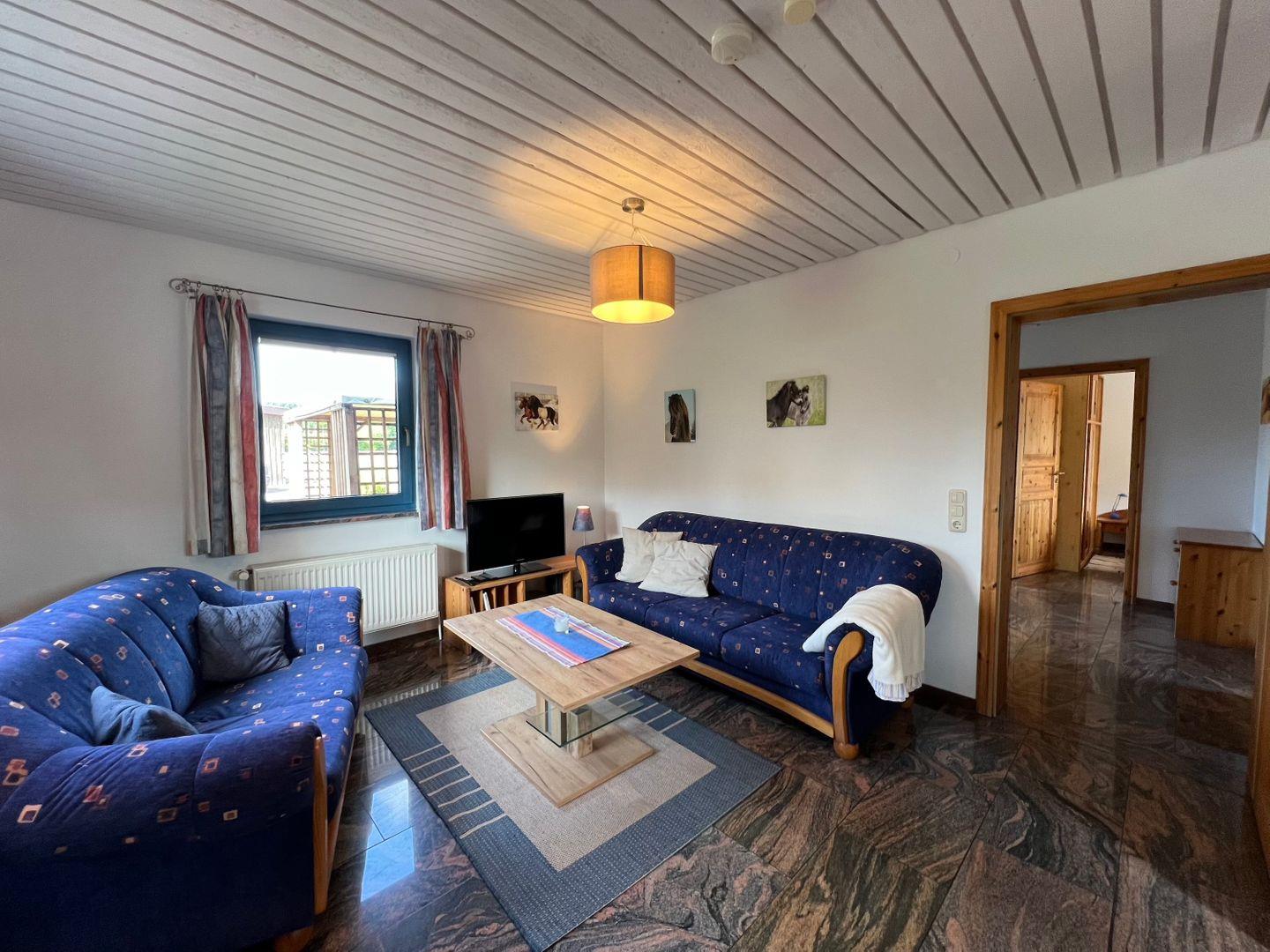 Die ca. 60qm große Ferienwohnung Isi-Blick auf Osterbyholz bietet Platz für bis zu 4 Personen und teilt sich in eine vollausgestattete Küche mit Esstisch und (natürlich) Blick auf den Hof, Offenställe und die Ovalbahn der Anlage. Die komplette Wohnung ist mit hochwertigen Granitböden ausgestattet. Über den hellen Flur gelangt man in das Hauptschlafzimmer, welches ausgestattet mit einem komfortablem Doppelbett, nach hinten hinaus ruhig zu den Paddocks liegt, einzig ein zufriedenes Schnauben der Pferde könnte die Ruhe unterbrechen. Mittig liegt das Duschbad der Wohnung, dieses verfügt selbstverständlich über Tageslicht. Im hinteren Teil der Ferienwohnung befindet das großzügige und helle Wohnzimmer. Neben einer gemütlichen Sofaecke befindet sich hier auch noch ein weiteres Sofa, welches zur Schlafcouch umfunktioniert werden kann und Platz für zwei weitere Personen. Die drei Außenwände des Wohnzimmers bieten einen sagenhaften Rundumblick auf die wunderschönen Islandpferde, egal wo man hinschaut.