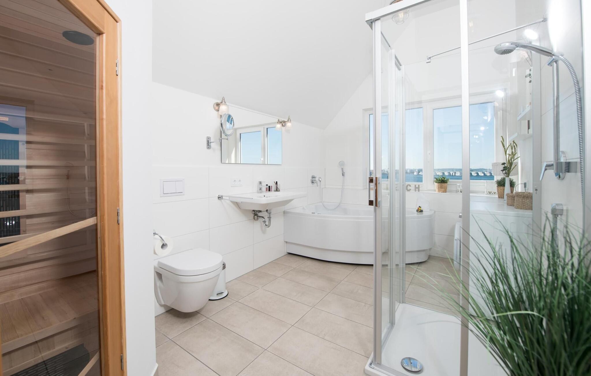 Das große Badezimmer befindet sich ebenfalls auf der zweiten Wohnebene. Eine Infrarot Wärmekabine für zwei Personen, Hifi-Sound-System und