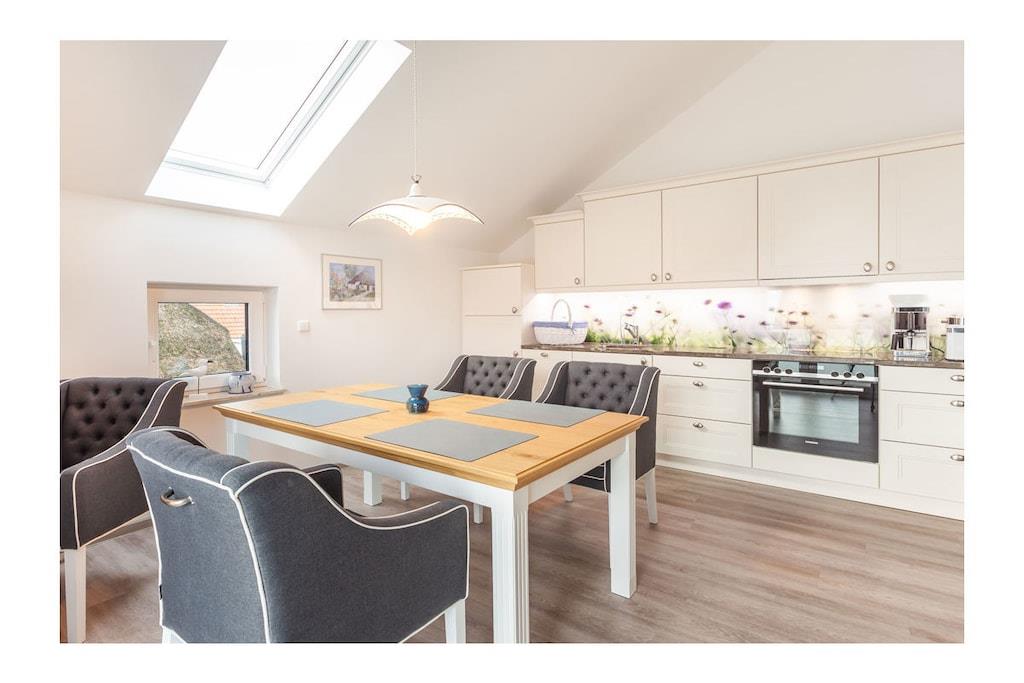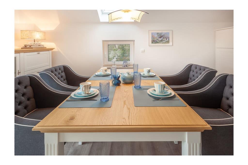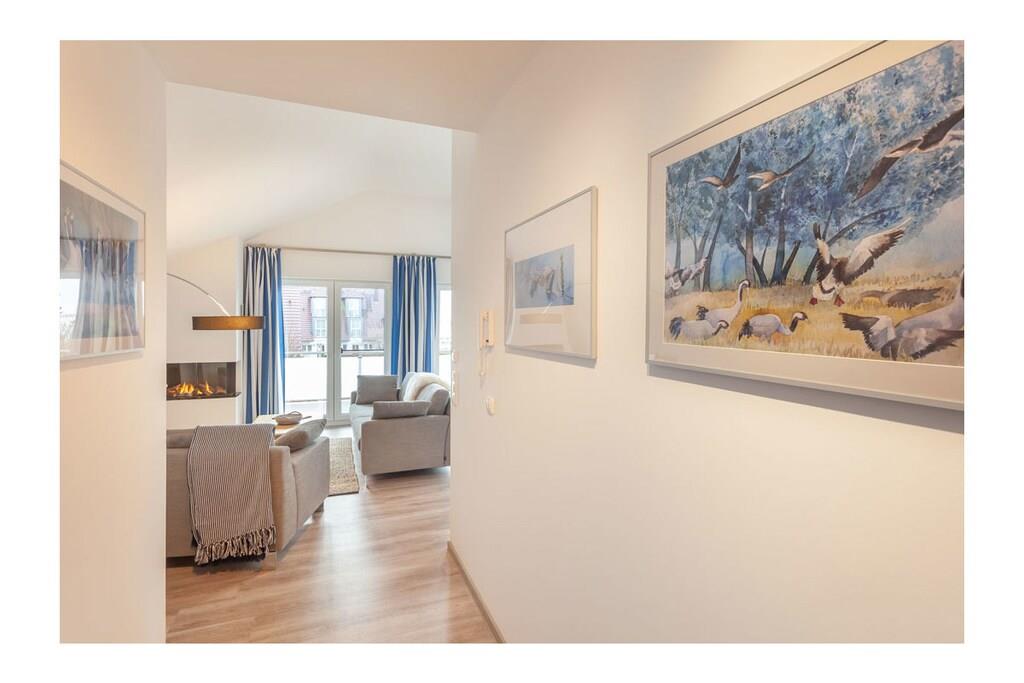 Offener Wohn- & Essbereich mit hochwertiger Couchlandschaft auf Designerboden, TV/Sat (Flatscreen/Smart-TV), Radio/ CD, kostenloses WLAN, Gaskamin, Zeitschriften und Gesellschaftsspiele für gemütliche Abende, hochwertige Luxus-Einbauküche mit 4-Plattenherd (Induktion), Backofen, Kühlschrank mit großem Gefrierfach, Geschirrspüler und vielen Elektrogeräten (z.B. Kaffemaschine, Wasserkocher, Brotschneidemaschine, Zitruspresse, Toaster und vieles mehr), luxuriöses Badezimmer mit Schwallbrause, LED – Spiegel, Fön, eine Sauna und separates WC, 1. Schlafzimmer mit komfortablen Doppelbett (1 Matratzen 180 x 200), beleuchteten Kleiderschrank und Kommode, 2. Schlafzimmer mit zwei komfortablen Einzelbetten (90 x 200), Sideboard, Kleiderschrank & TV/Sat (Flatscreen/Smart-TV), Hauswirtschaftsraum mit Waschmaschine/ Trockner, Bügelbrett und Bügeleisen, Wäschekorb, Trocknergestell und Staubsauger Außenbereich: große Loggia (überdachter Balkon), Balkonlounge mit zwei Liegen und Sonnenschirm, Boddenblick Freuen Sie sich auf einen unvergesslichen Urlaub im schönen Seebad Breege/Juliusruh! Qualität, Design und Luxus sorgen in der erstklassigen Ferienwohnung „Dreimasterhaus Nr. 5“ für einen perfekten Ostseeurlaub. Die exklusiv neu eingerichtete Ferienwohnung mit großer Loggia, im Ortskern von Breege, lässt keine Wünsche offen. Das lichtdurchflutete Wohnzimmer mit einer Deckenhöhe bis zu 3,50 m, sorgt für eine ausgezeichnete Atmosphäre. Die Dachfenster sind mit elektrischen Jalousien ausgestattet. Genießen Sie nach der Sauna die frische Ostseeluft oder relaxen Sie einfach auf den Loungestühlen in der Sonne. Sie wohnen ruhig, komfortabel und dicht am Großen Jasmunder Bodden. Ein kleiner Schreibtisch im Wohnzimmer bietet Platz für einen Laptop und kleine Arbeiten, falls das Berufsleben mal nicht warten kann. Die Ferienwohnung ist eine Nichtraucherwohnung. An allen Fenstern befinden sich Insektenschutzgitter und in allen Räumen ist Fußbodenheizung. Frische Brötchen bekommen Sie in unmittelbarer Nähe im Hafenshop. Einkaufsmöglichkeiten, Bäcker und Restaurant in Laufnähe. Der ca. 250 m entfernte Hafen, bietet Ausflugsmöglichkeiten per Schiff zur Insel Hiddensee, Boddenfahrten, Kranichfahrten und zu den Störtebeker-Festspielen. Es gibt optimale Rad- und Wandermöglichkeiten, um die Insel zu erkunden.