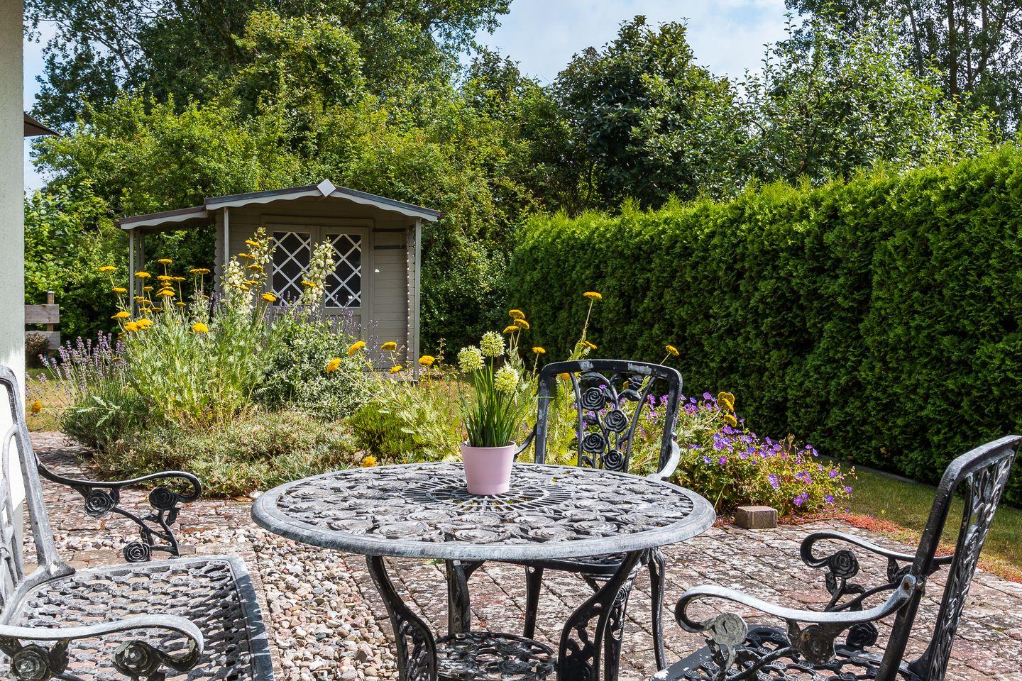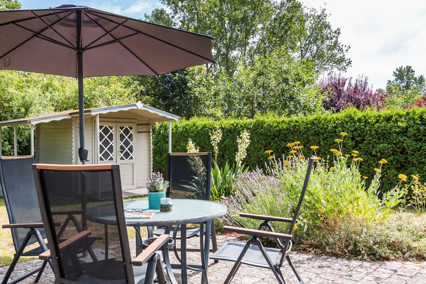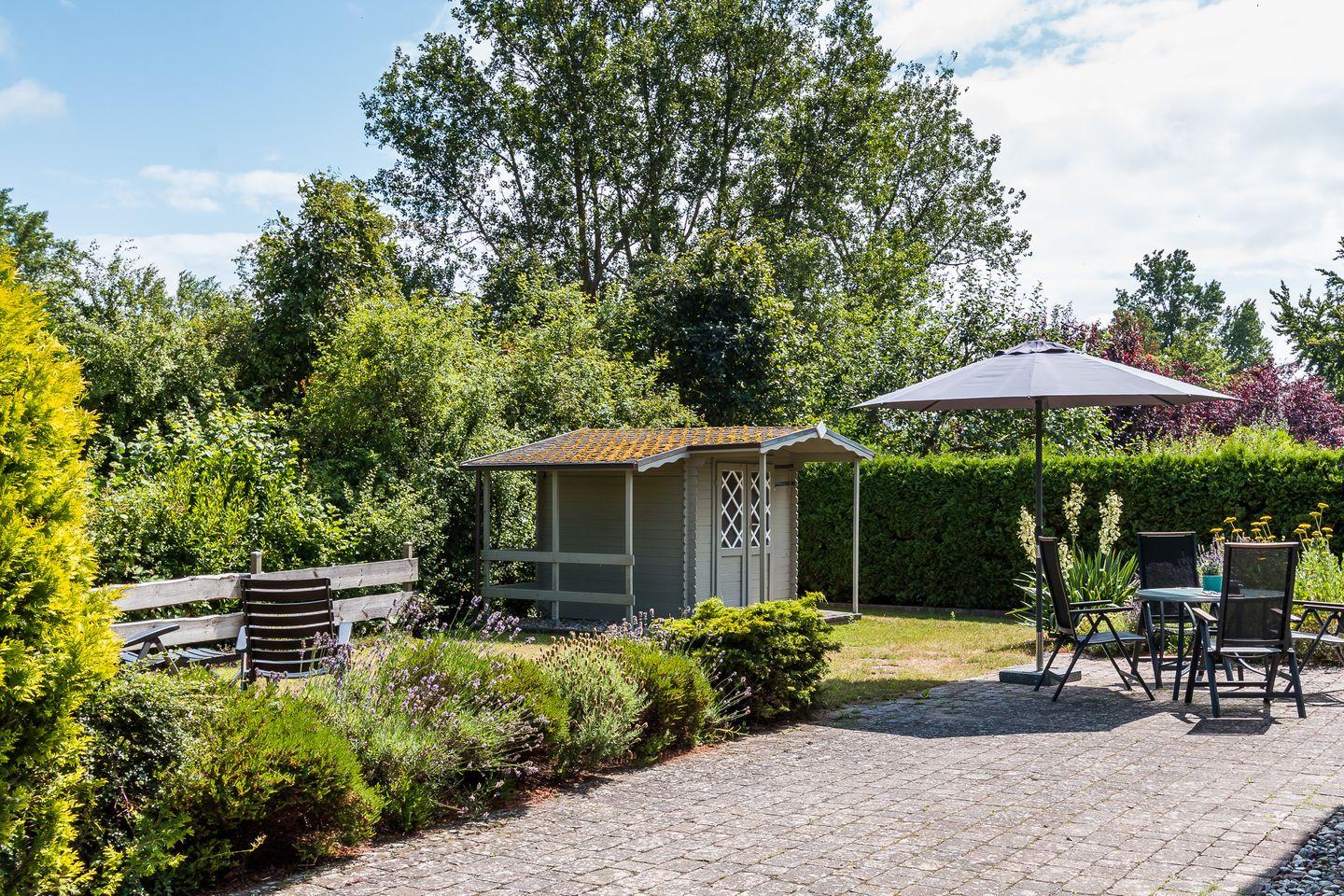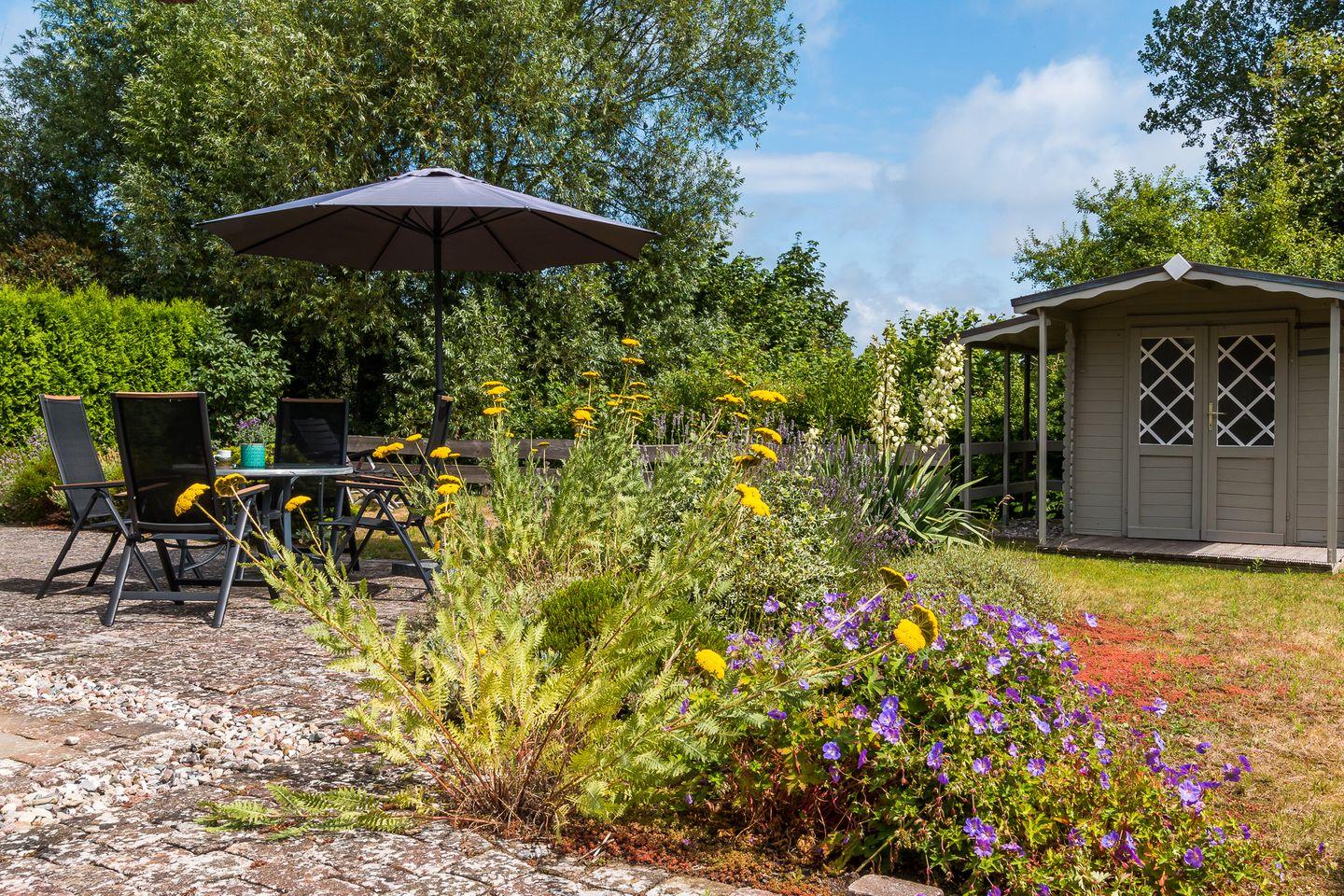 Der liebevoll angelegte Garten bietet dir zwei großzügige Steinterrassen mit Ost- und Süd-Ausrichtung. Hier kannst du sonnige und entspannte Stunden genießen - beispielsweise im hauseigenen Strandkorb im Garten. Des Weiteren stehen dir ein abschließbarer Fahrradschuppen und ein PKW-Stellplatz zur Verfügung.