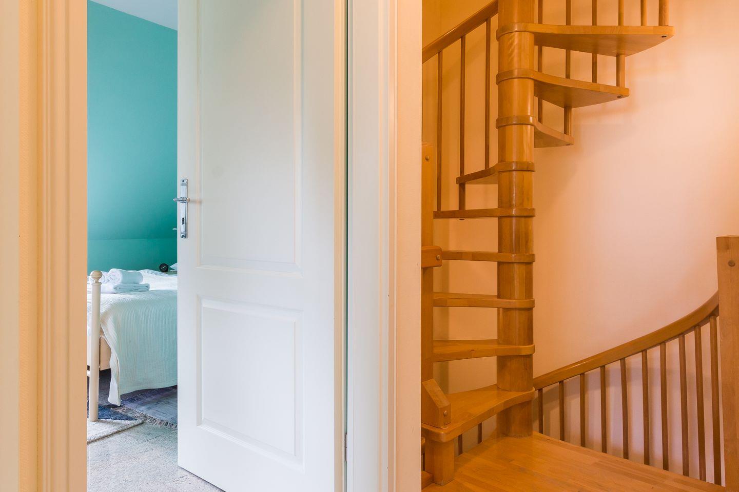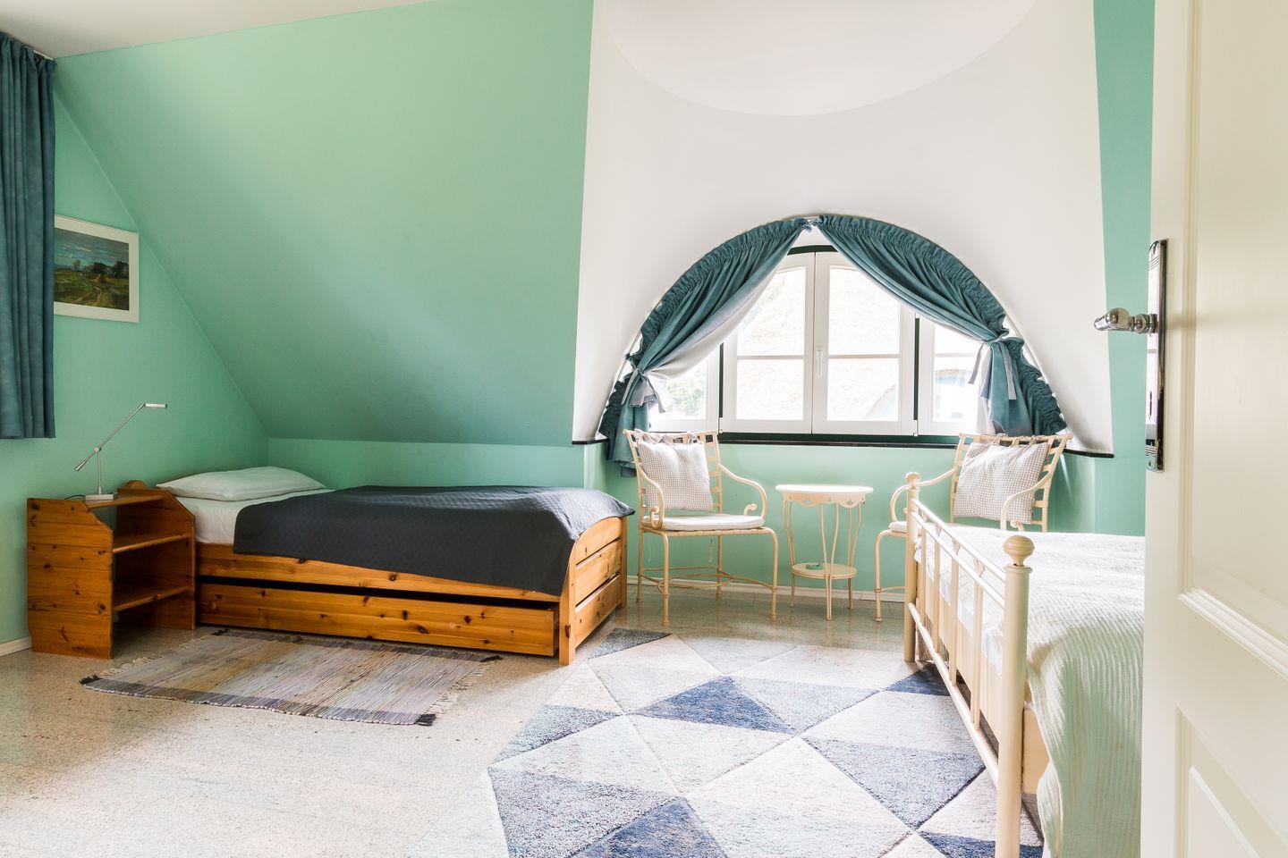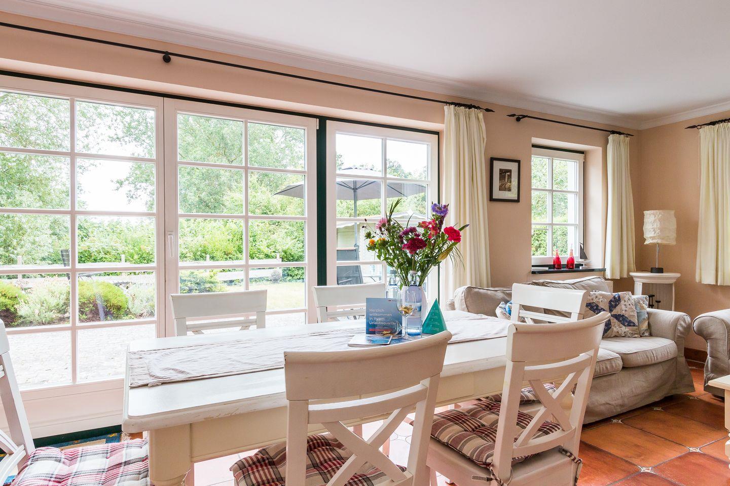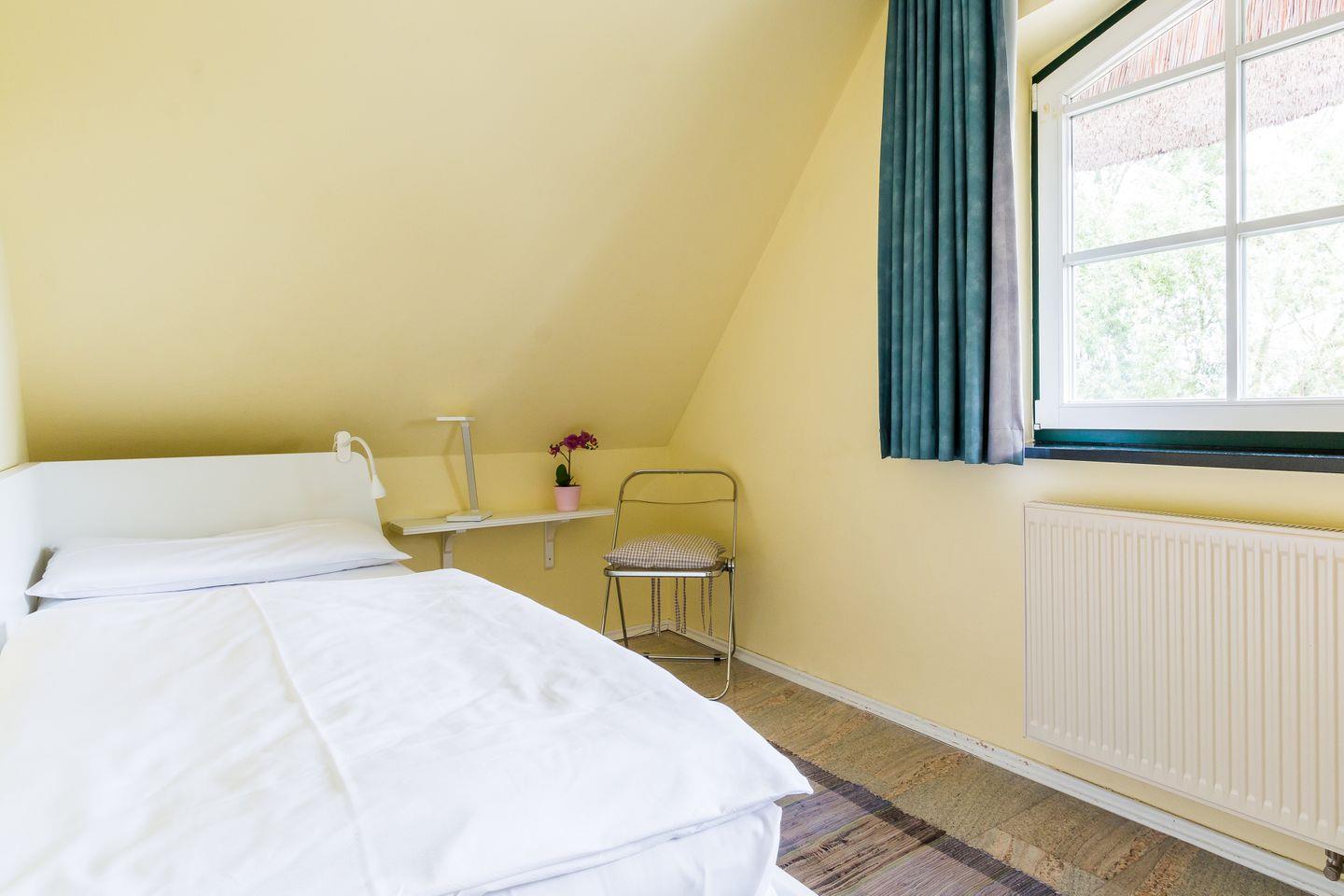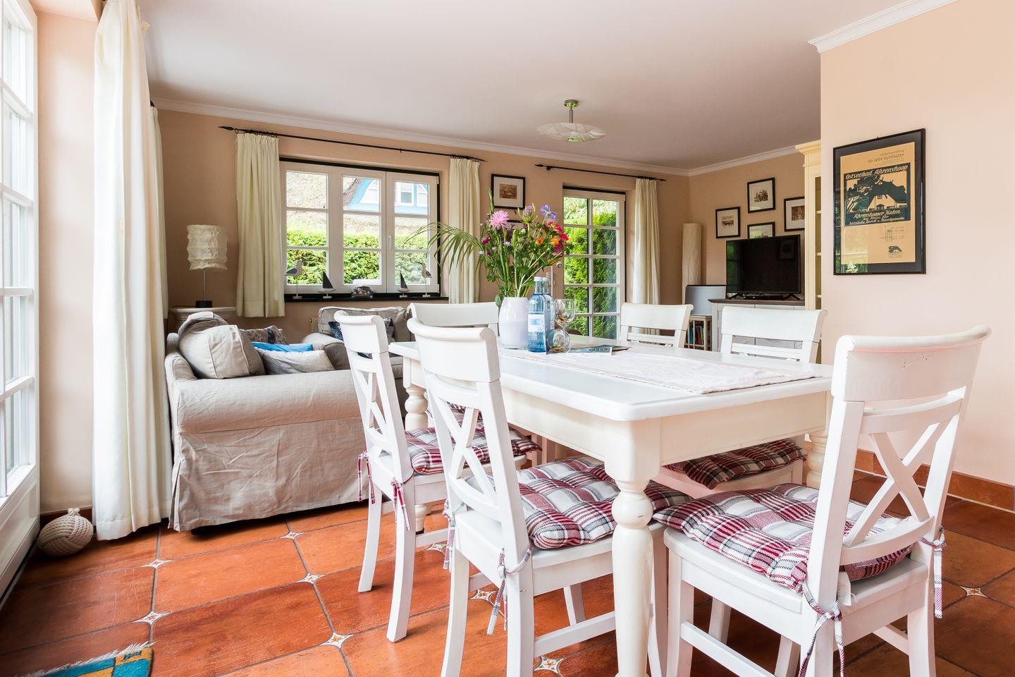 Im Erdgeschoss der Reetdach-Doppelhaushälfte befinden sich der offene und helle Wohnraum mit gemütlicher Sitzecke und integrierter Küche samt Essbereich. Ein Gäste-WC sowie ein Hauswirtschaftsraum mit Waschmaschine finden ebenfalls auf der unteren Etage Platz. Das erste Obergeschoss verfügt über das Hauptschlafzimmer mit einem Doppelbett, ein weiteres Schlafzimmer mit einem Tandembett für ein bis zwei Personen sowie ein modernes Bad mit Dusche/WC und Eckbadewanne.