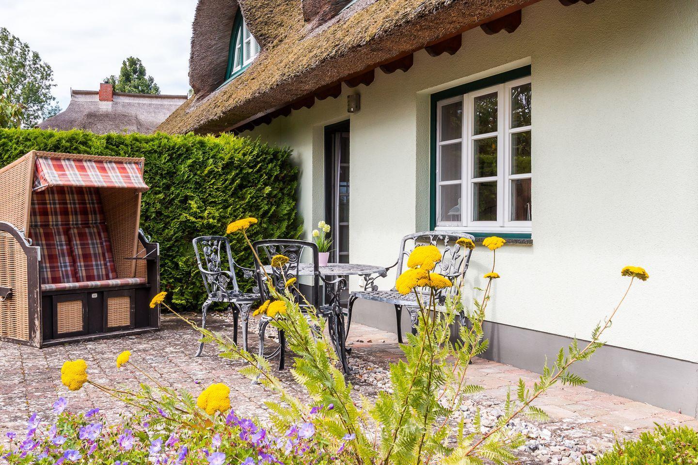 Charmantes Reetdach-Ferienhaus "Drömhus" in Ahrenshoop, strandnah mit Garten, Terrasse und Strandkorb.