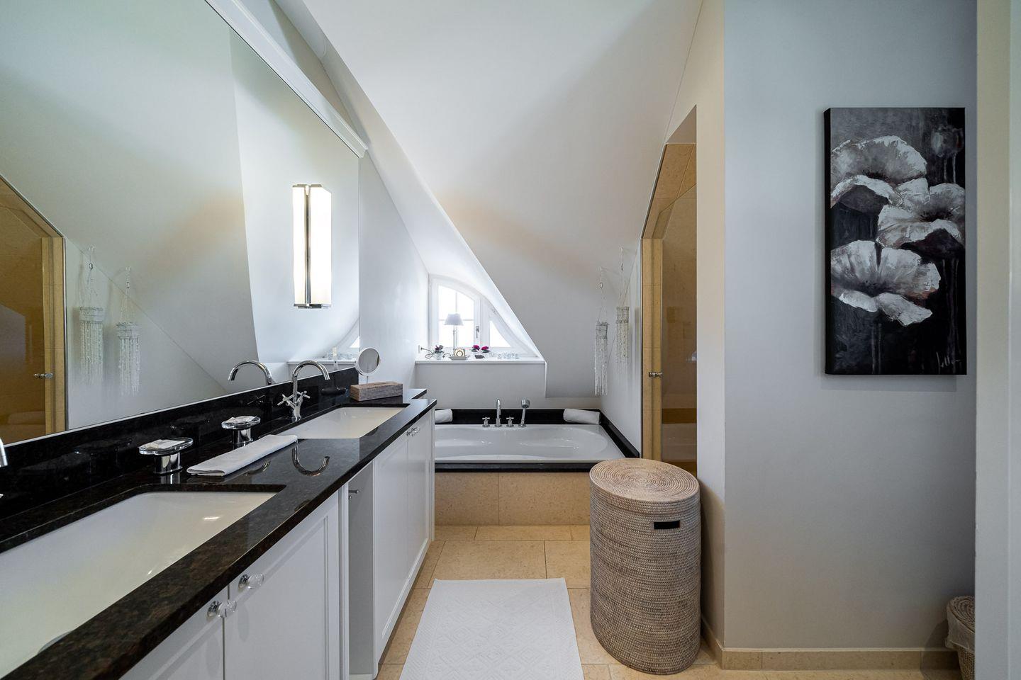 Tritt ein - in den Sonnenlicht durchfluteten Wohnraum, der über eine gemütliche Sitzecke am Kamin und einem einladenden Essbereich verfügt. Bereits vom Wohnraum aus genießt du den traumhaften Blick zur Ostsee. Die separate Küche bietet neben der hochwertigen Einbauküche auch einen kleinen Esstisch. Das Gäste-WC und ein Hauswirtschaftsraum befinden sich ebenfalls im Erdgeschoss. Über eine imposante Treppe gelangst du ins Dachgeschoss. Hier angekommen erwartet dich das seeseitig liegende Schlafzimmer mit Doppelbett, TV und einem Sekretär mit tollem Ausblick. Eine eigene Ankleide, ein luxuriöses Bad mit Doppelwaschtisch/ Badewanne/Wellnessdusche/WC sowie ein Balkon sorgen für weiteren Wohnkomfort. Das zweite Schlafzimmer verfügt ebenfalls über ein Doppelbett und einen TV. Das angrenzende Badezimmer ist mit einer Wellnessdusche ausgestattet.