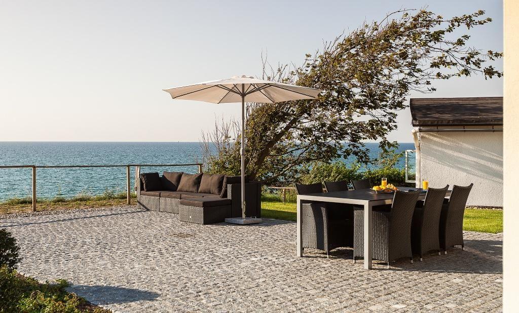 Der Außenbereich begeistert mit einem spektakulären Blick von der Steilküste auf die Ostsee. Dank der Terrasse mit hochwertiger Bestuhlung, Sonnenschirm und Sonnenliegen kannst du bei Wellenrauschen deinen Urlaub mit allen Sinnen genießen. Hier steht einem Frühstück am Meer, entspannten Stunden und einem traumhaften Abendausklang mit den für die Halbinsel so berühmten Sonnenuntergängen nichts mehr im Wege. Dir stehen zwei PKW-Stelllätze zur Verfügung.