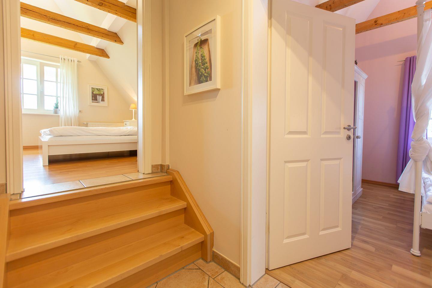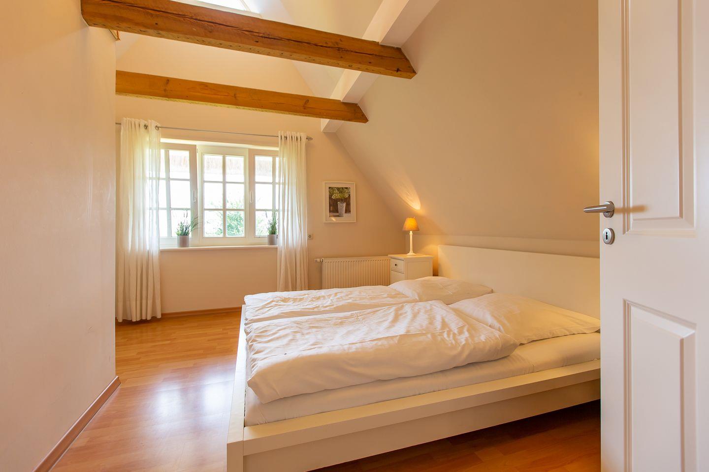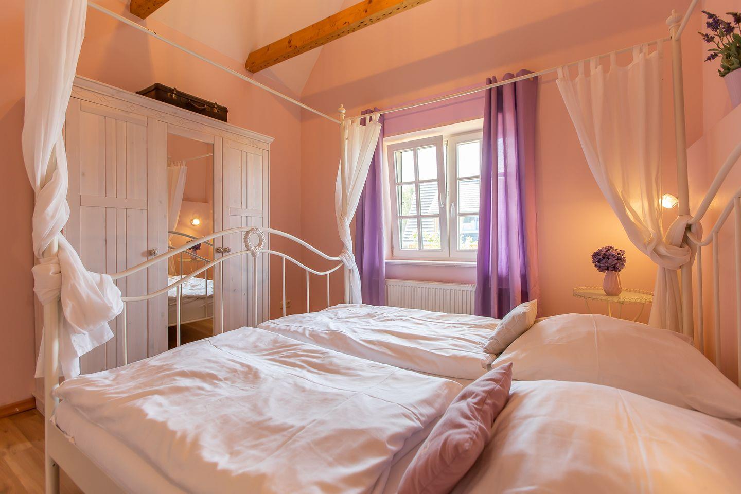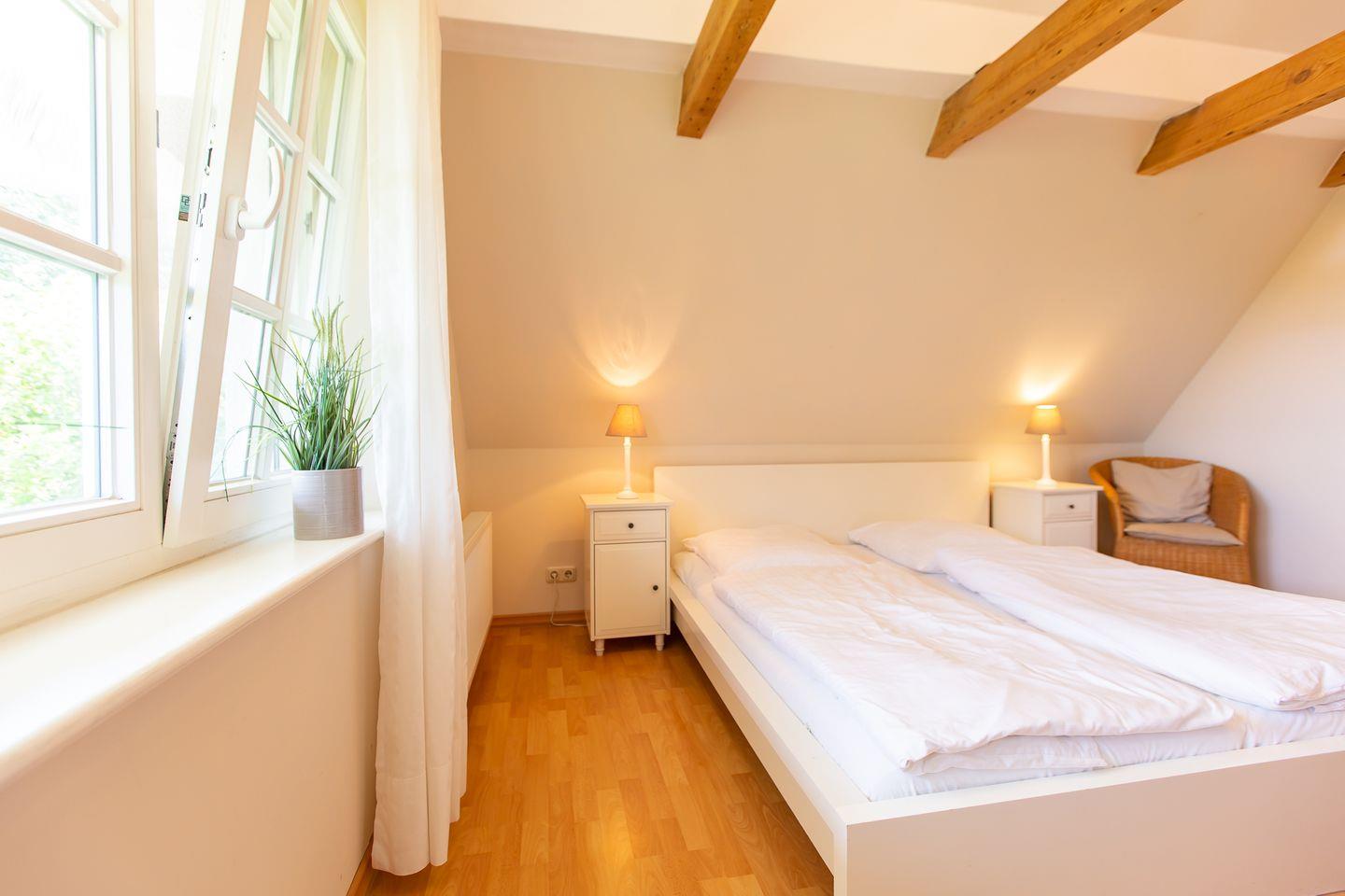 Im Erdgeschoss erwartet dich der großzügige Wohnraum mit einer gemütlichen Sitzecke am Kaminofen. Der große Esstisch ist im Wohnbereich integriert und bietet ausreichend Platz für die ganze Familie. Die offen gestaltete Küche befindet sich angrenzend am Essbereich und lässt beim Kochen keine Wünsche offen. Weiterhin befindet sich auf der unteren Etage ein Bad mit Dusche/WC. Das Obergeschoss beherbergt zwei Schlafzimmer, die jeweils mit Doppelbetten ausgestattet sind. Aus einem der Schlafzimmer genießt du sogar einen kleinen Ausblick auf den Bodden. Weiterhin schließt sich das Bad/WC mit Dusche und Badewanne an.