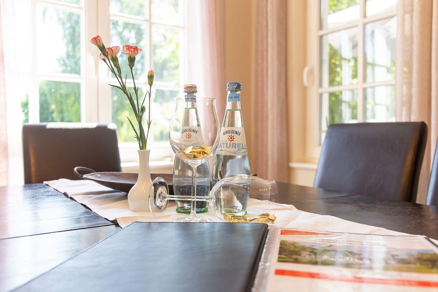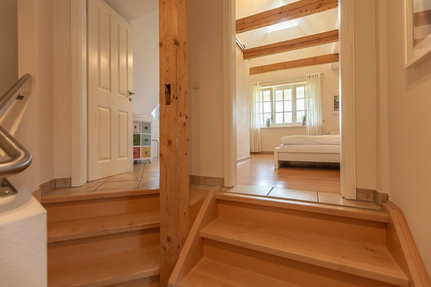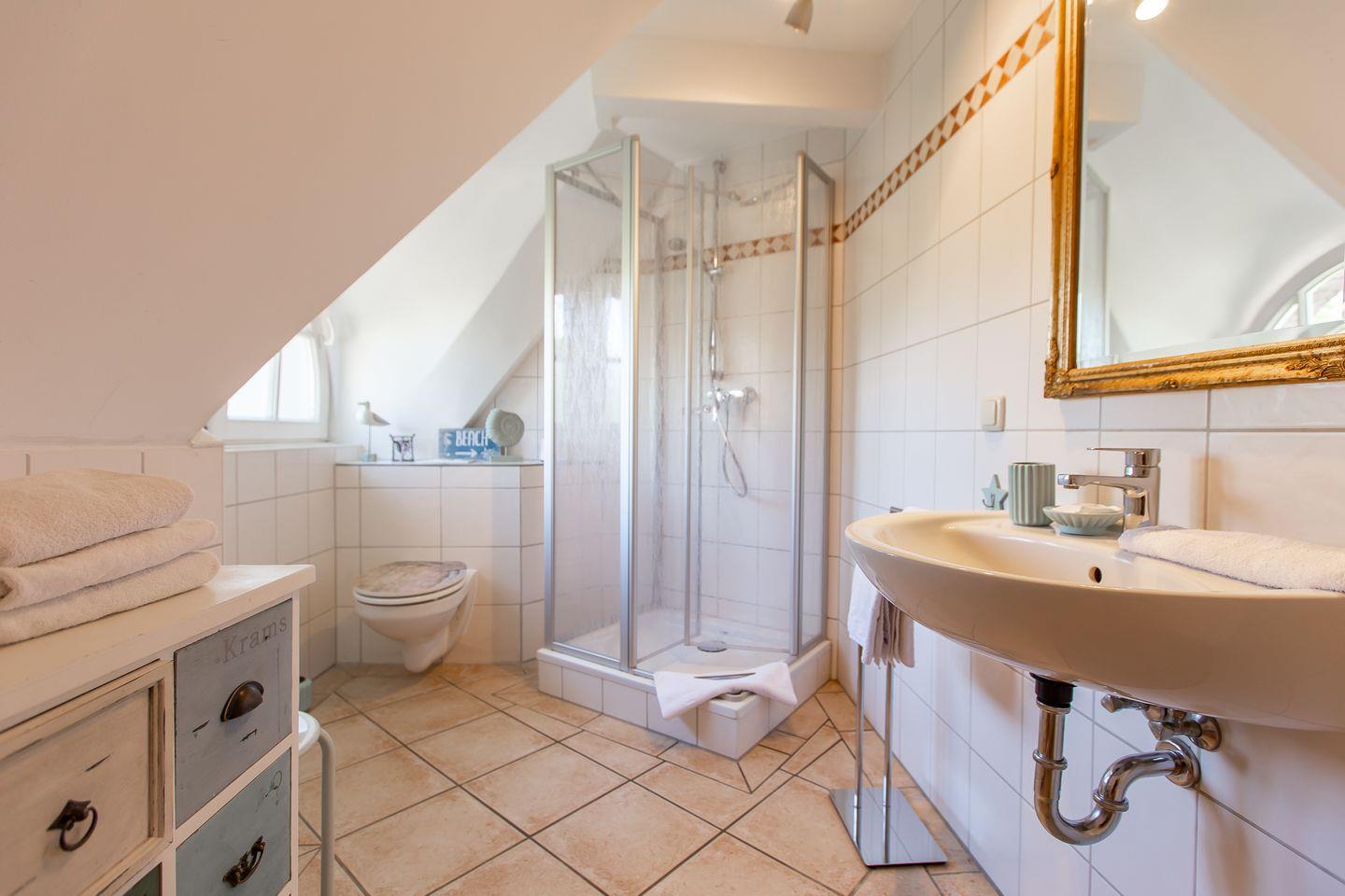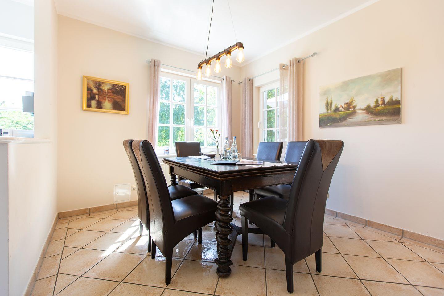 Im Erdgeschoss erwartet dich der großzügige Wohnraum mit einer gemütlichen Sitzecke am Kaminofen. Der große Esstisch ist im Wohnbereich integriert und bietet ausreichend Platz für die ganze Familie. Die offen gestaltete Küche befindet sich angrenzend am Essbereich und lässt beim Kochen keine Wünsche offen. Weiterhin befindet sich auf der unteren Etage ein Bad mit Dusche/WC. Das Obergeschoss beherbergt zwei Schlafzimmer, die jeweils mit Doppelbetten ausgestattet sind. Aus einem der Schlafzimmer genießt du sogar einen kleinen Ausblick auf den Bodden. Weiterhin schließt sich das Bad/WC mit Dusche und Badewanne an.