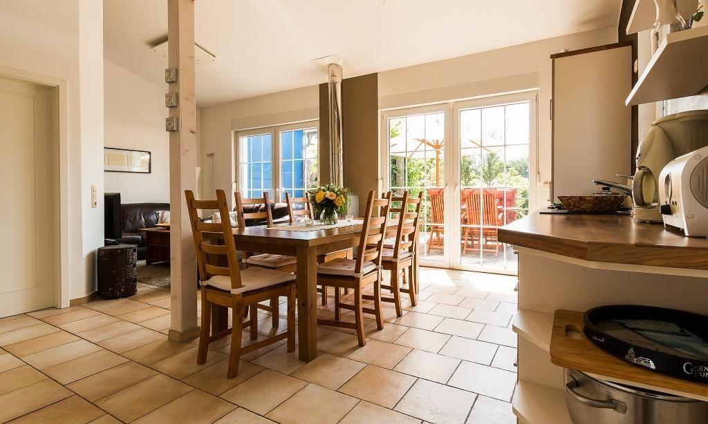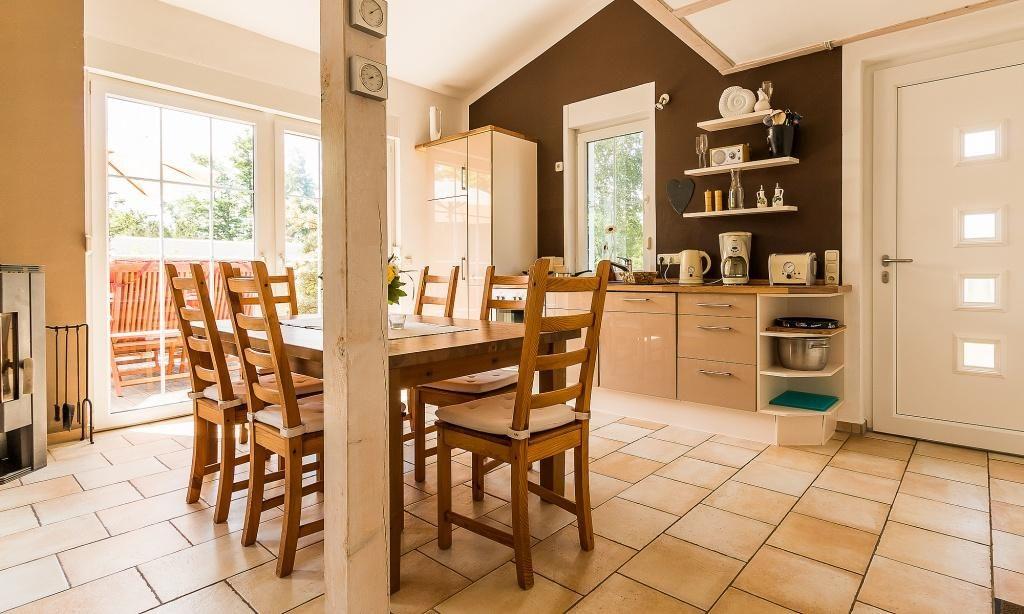 Im Erdgeschoss empfängt dich der Wohnraum mit einer gemütlichen Sitzecke am Kaminofen. Von hier aus gelangst du direkt auf die große Holzterrasse. Die voll ausgestattete Küchenzeile mit großem Esstisch ist unmittelbar integriert und schafft einen offenen Wohncharakter. Das großzügiges Bad ist mit Dusche/WC sowie einer Waschmaschine ausgestattet. Weiterhin gibt es zwei separate Schlafzimmer, die jeweils über ein Doppelbett verfügen.