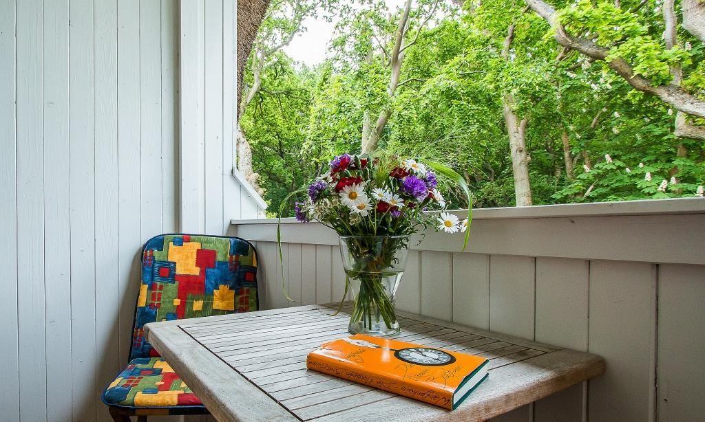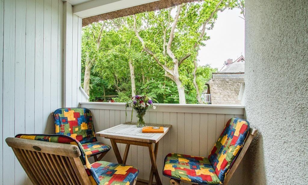 Strandnahe Ferienwohnung in Ahrenshoop mit Balkon, Gartenblick und Strandkorb – ideal für bis zu 6 Gäste.