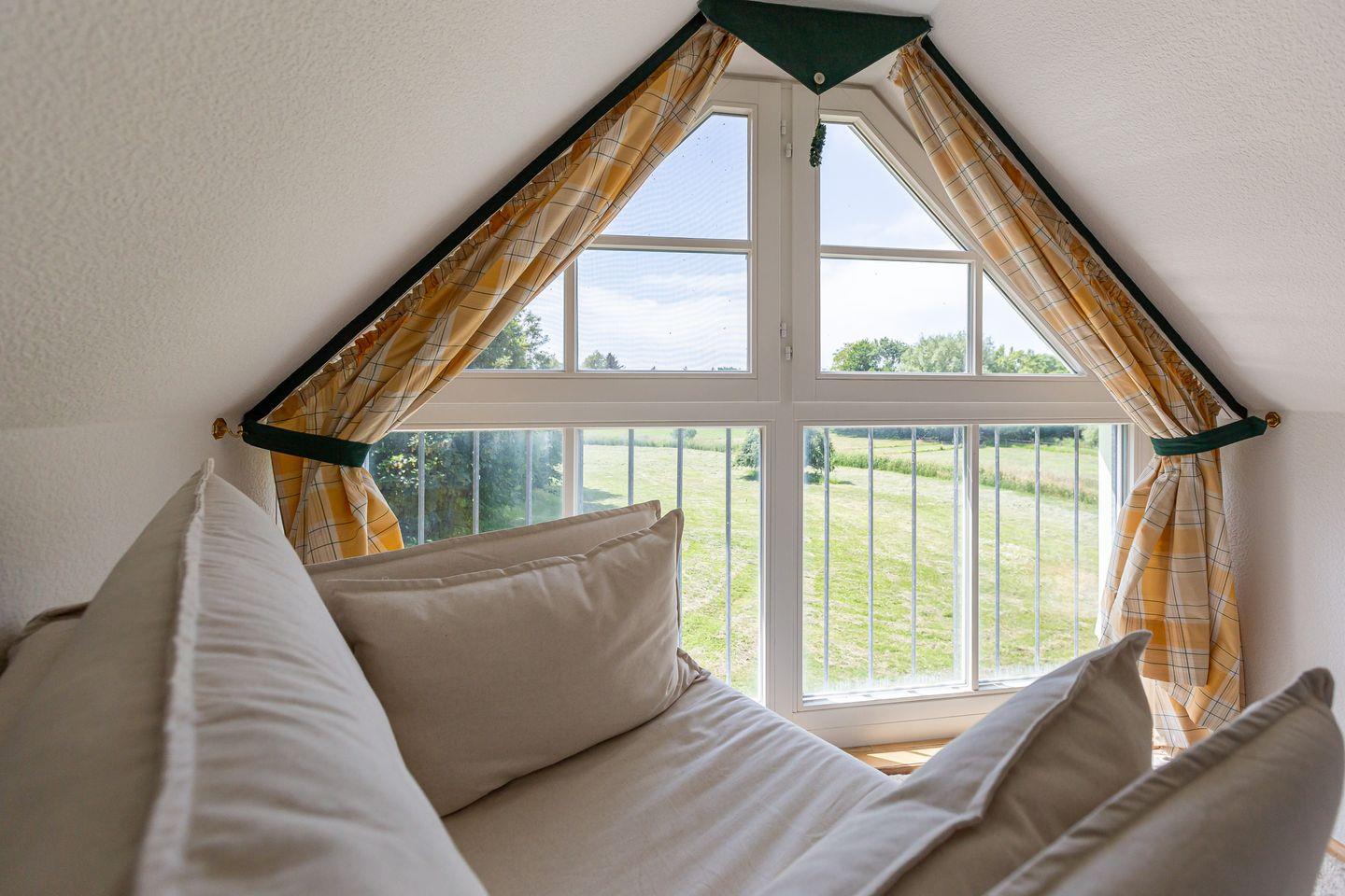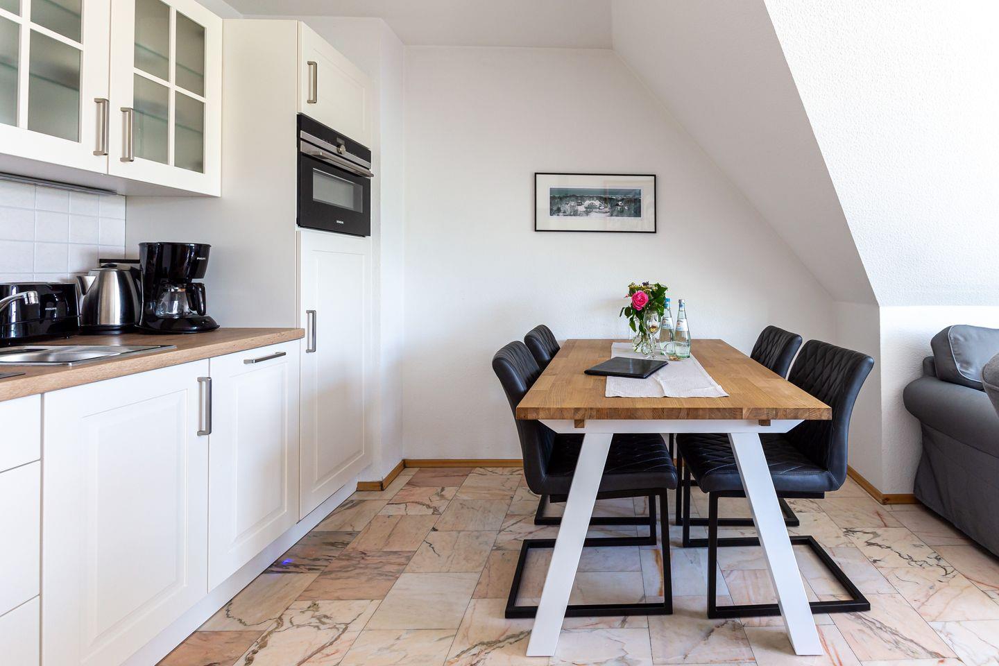 Die Wohnung befindet sich im ersten Obergeschoss eines Mehrfamilienhauses und erstreckt sich über zwei Etagen. Der Wohnraum empfängt dich mit einer gemütlichen Sitzecke am Kaminofen. Die Küchenzeile mit angrenzendem Essbereich ist unmittelbar integriert und schafft einen offenen Wohncharakter. Das Schlafzimmer ist mit einem Doppelbett ausgestattet. Das Bad verfügt über Dusche/WC sowie eine Waschmaschine. Der Balkon ist sowohl vom Wohnbereich, als auch vom Schlafzimmer aus begehbar. Über eine Wendeltreppe gelangst du ins offen gestaltete Dachgeschoss. Von hier genießt du einen freien Blick auf eine wildwachsende Wiese. Auch ein zweiter Schlafbereich mit einem Doppelbett befindet sich hier.