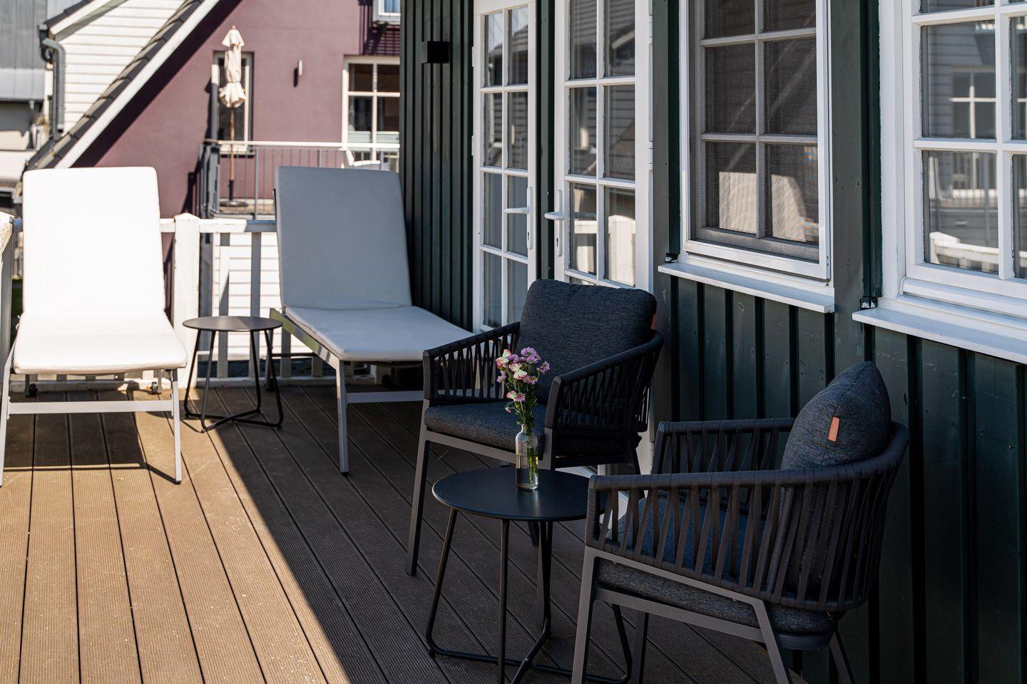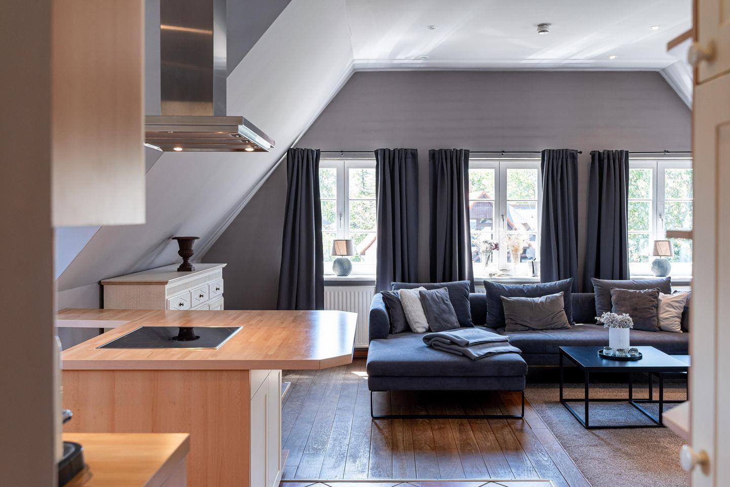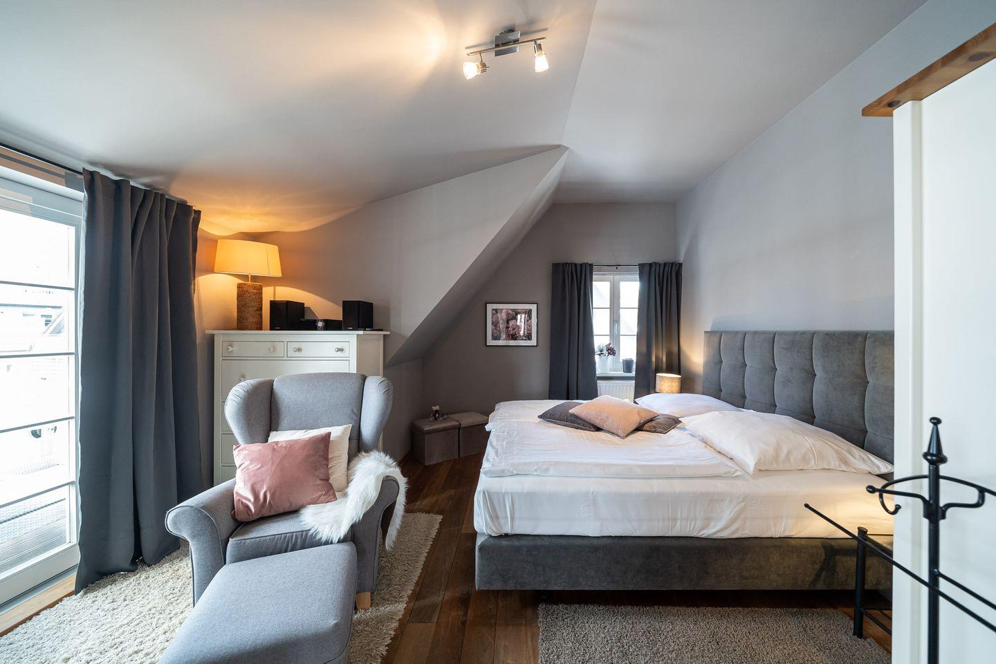 Diese stilvolle Ferienwohnung erstreckt sich über das gesamte Dachgeschoss eines gepflegten Geschäftshauses und bietet viel Raum zum Ankommen, Durchatmen und Wohlfühlen – perfekt für einen erholsamen Urlaub mit bis zu vier Personen. Der Zugang zur Ferienwohnung erfolgt über eine außenliegende Treppe. Die seeseitige Dachterrasse macht Lust auf Meer, Sonne und entspannte Urlaubstage. Im Inneren erwartet dich ein großzügiger, lichtdurchfluteter Wohnbereich mit gemütlicher Sitzecke und einem einladenden Essplatz für gemeinsame Mahlzeiten und lange Abende.