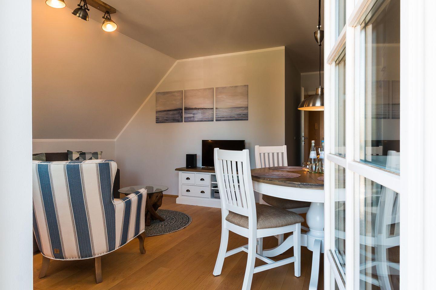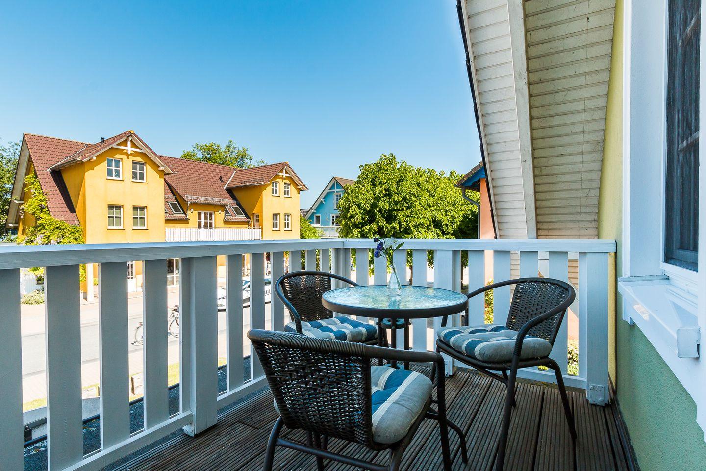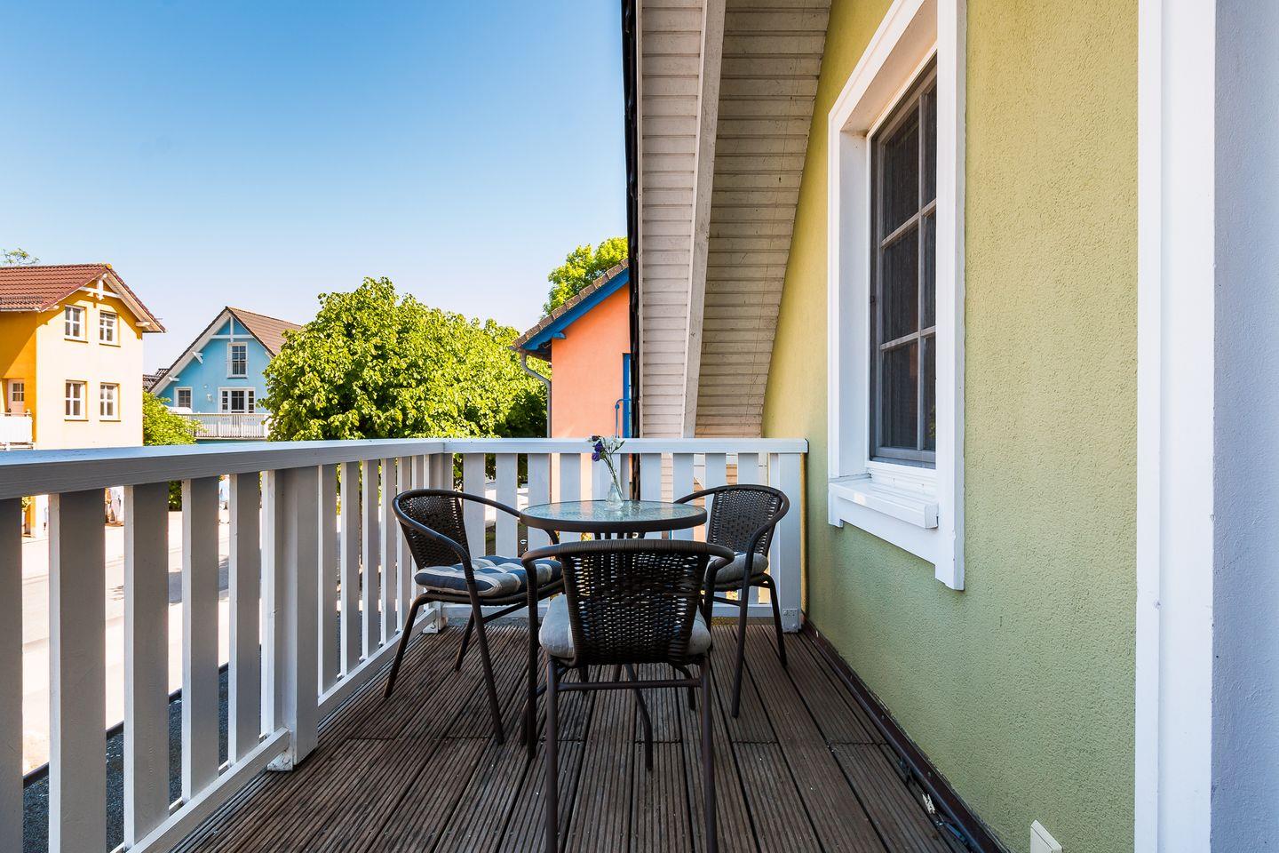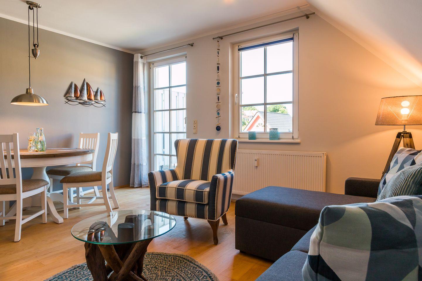 Gemütliche Ferienwohnung Mädesüß 01 in Ahrenshoop, strandnah mit Balkon und moderner Ausstattung.