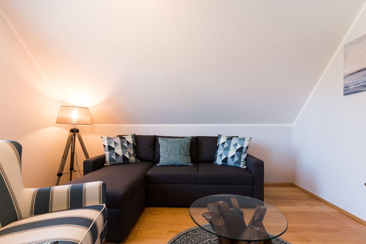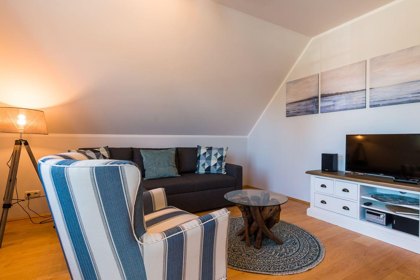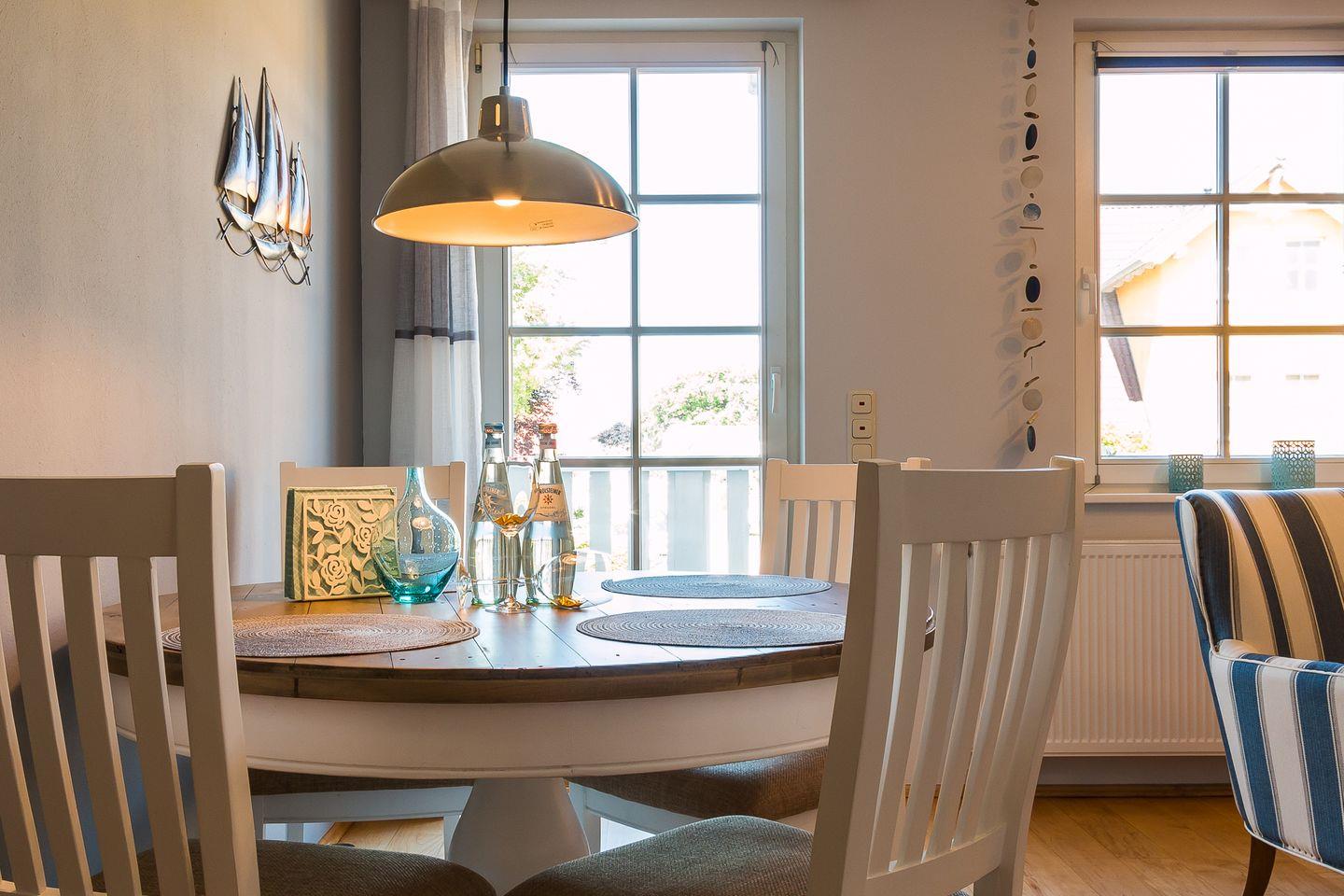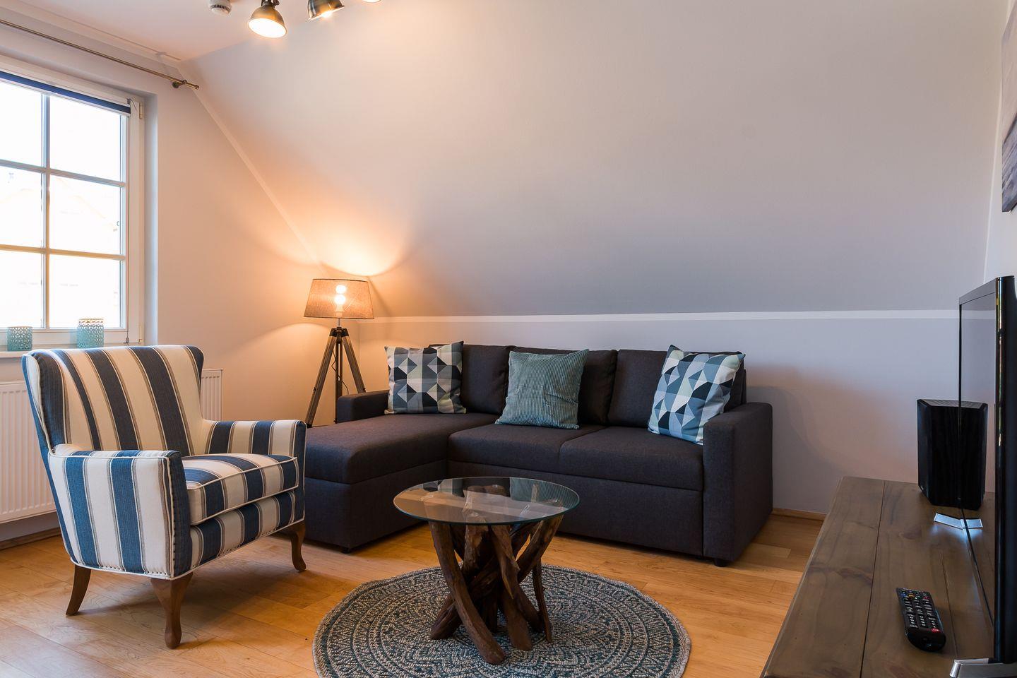 Gemütliche Ferienwohnung Mädesüß 01 in Ahrenshoop, strandnah mit Balkon und moderner Ausstattung.