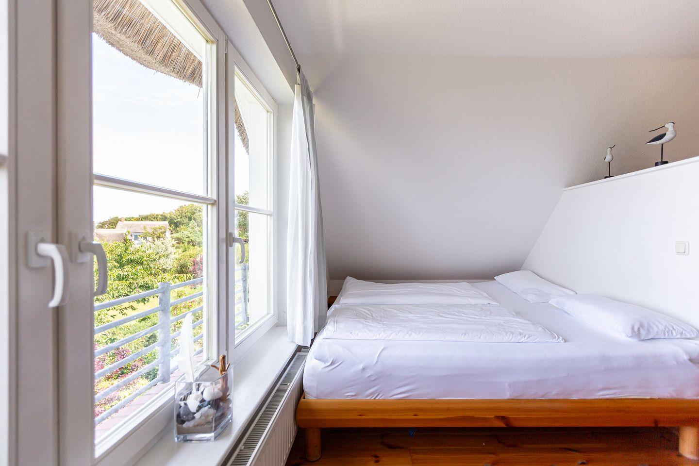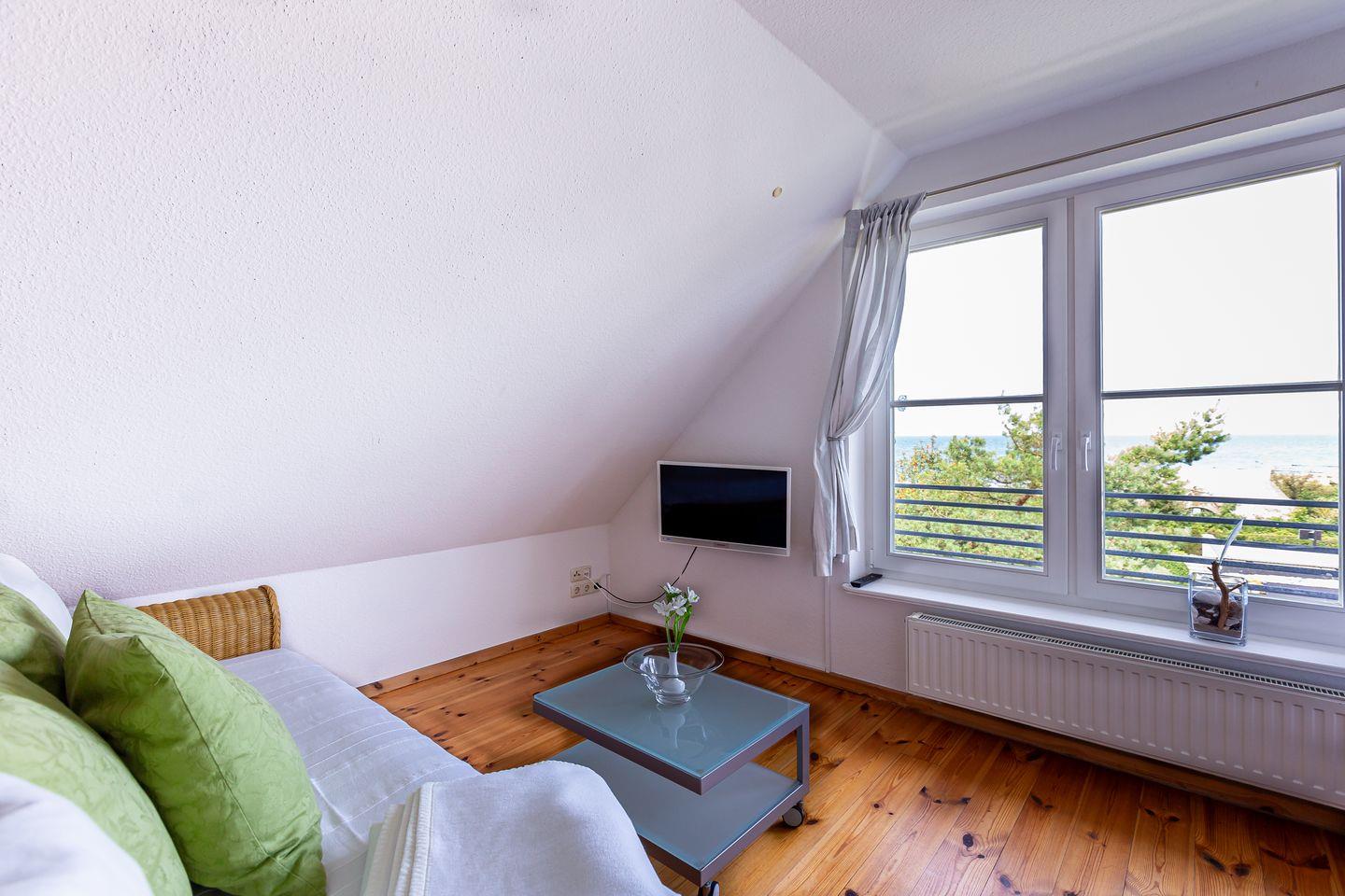 Das Ein-Raum-Appartement im Dachgeschoss verfügt über einen Wohn-und Schlafbereich mit gemütlicher Sitzecke, einem Doppelbett (180 cm) und einer kleine Küchenzeile mit Esstisch. Das Tageslichtbad mit Dusche/WC und Handtuchtrockner befindet sich separat. Du genießt aus der Wohnung einen traumhaften Meerblick.