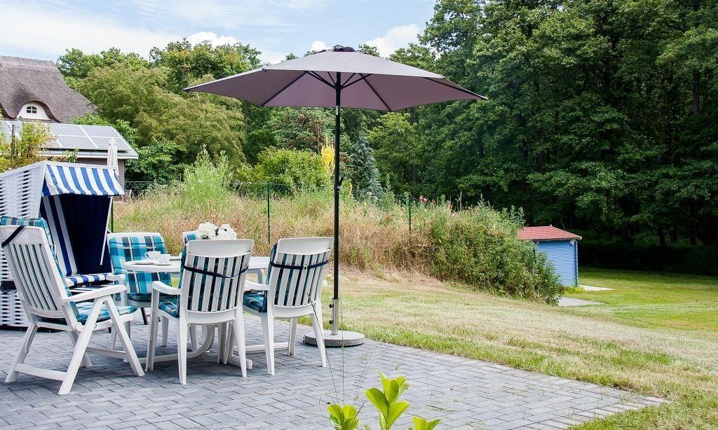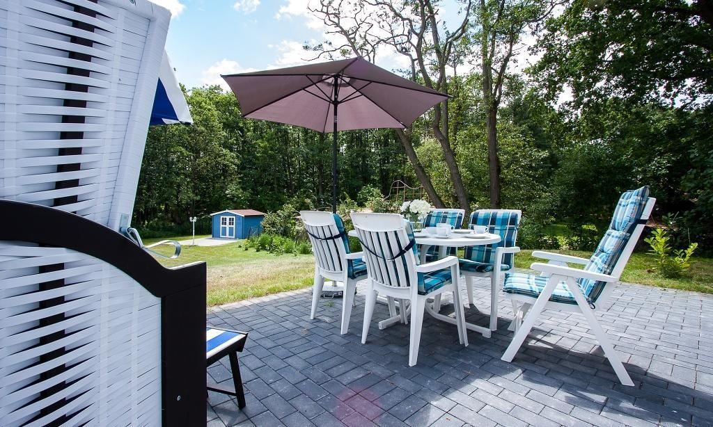 Im Außenbereich erwartet dich eine Steinterrasse mit Gartenmöbeln und Kamingrill. Ein Strandkorb und zwei Sonnenliegen befinden sich ebenfalls am Haus und stehen für erholsame Stunden bereit. So schön kann Urlaub sein. Der große Garten ist für die gemeinschaftliche Nutzung vorgesehen. Dir stehen außerdem ein abschließbarer Fahrradschuppen sowie zwei PKW-Stellplätze zur Verfügung.