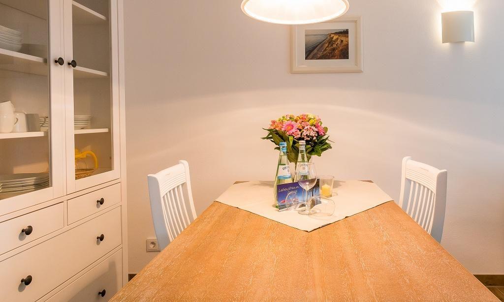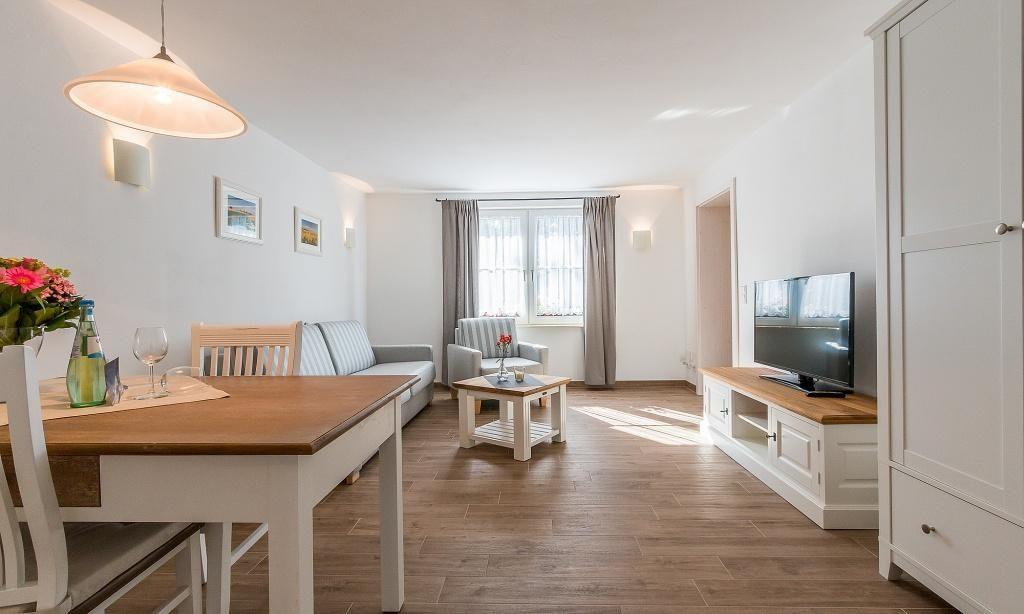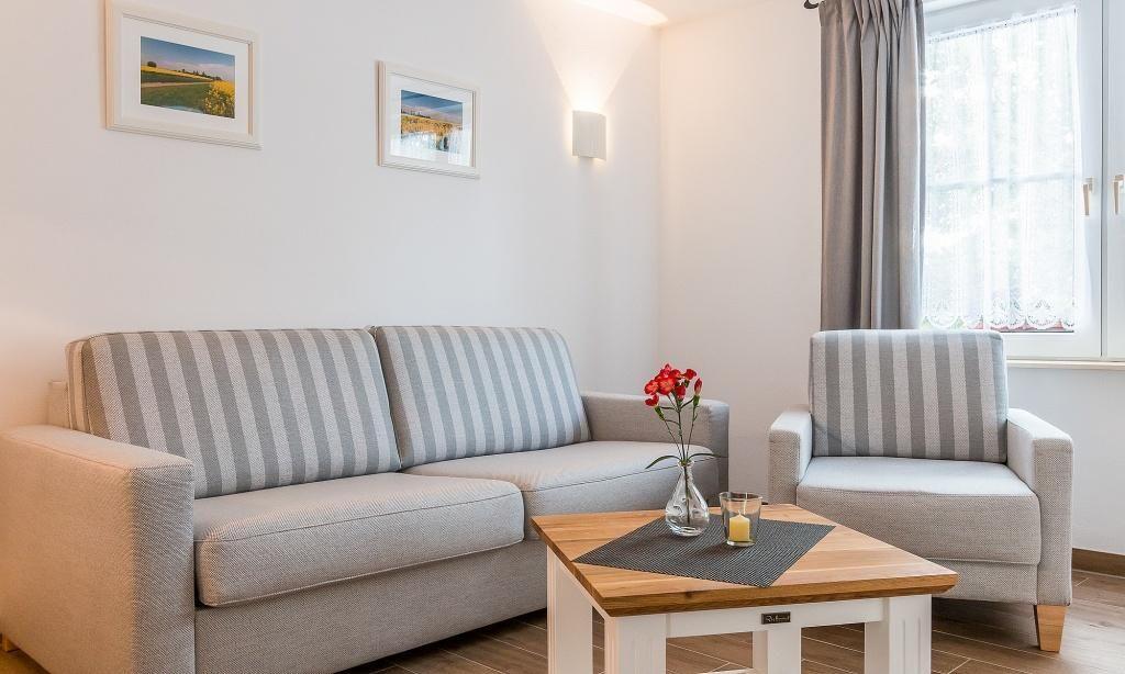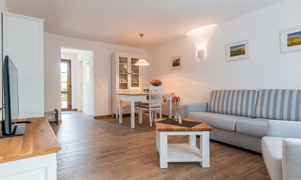 Die Erdgeschosswohnung empfängt dich mit einem großzügigen Wohnbereich mit Essecke sowie einem Schlafzimmer mit Doppelbett und Kleiderschrank. Die Küchenzeile ist in einem kleinen Flur und Austritt zu Terrasse integriert. Das Badezimmer verfügt über Dusche/WC. Eine Aufbettung für zwei Personen ist im Wohnbereich auf dem Sofa möglich. Die liebevolle Einrichtung und das freundliche Umfeld garantieren einen erholsamen Urlaub in unmittelbarer Nähe zum Strand.