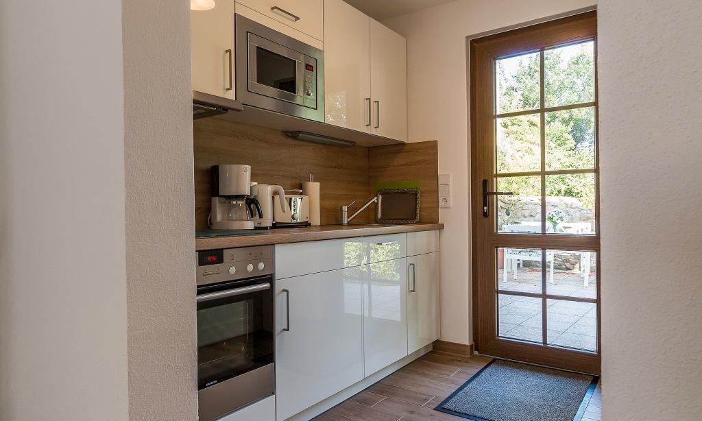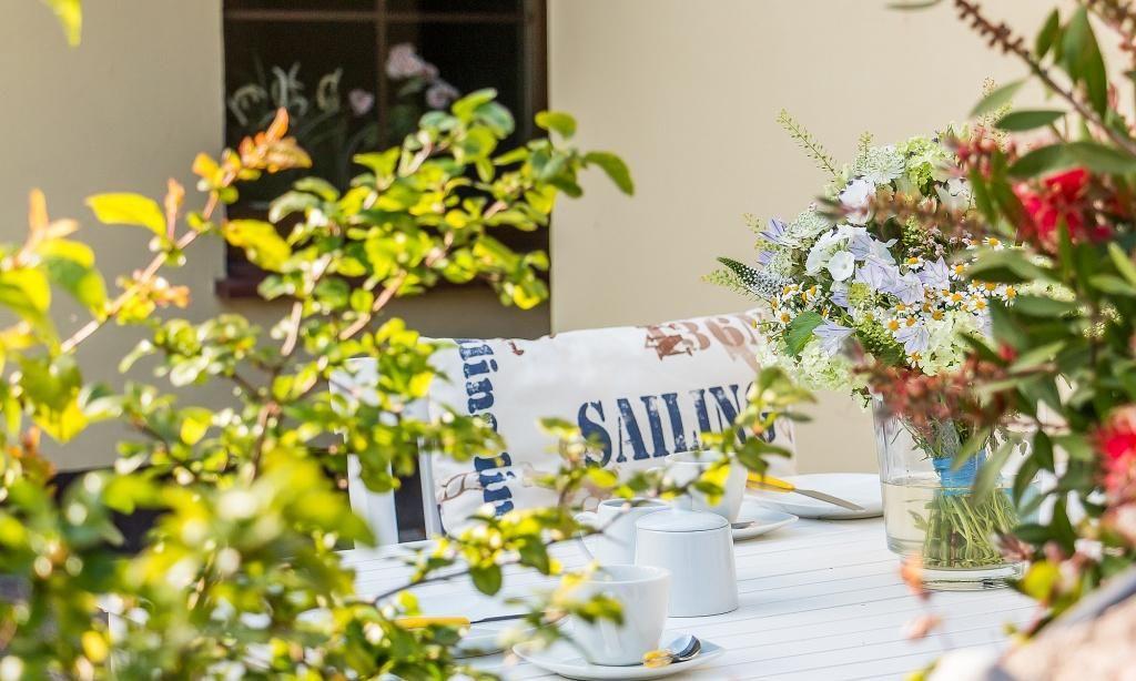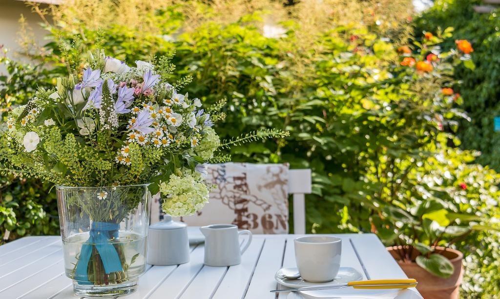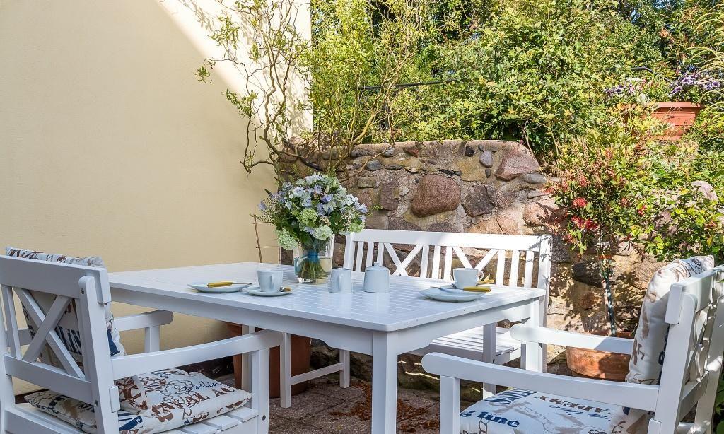 Zur Ferienwohnung gehört eine kleine und windgeschützte Terrasse sowie ein PKW-Stellplatz. Der Garten kann gemeinschaftlich genutzt werden.
