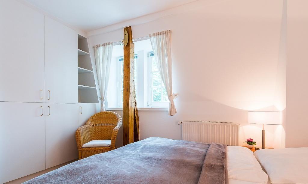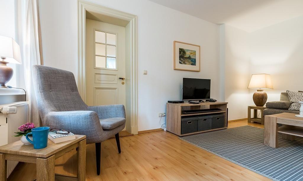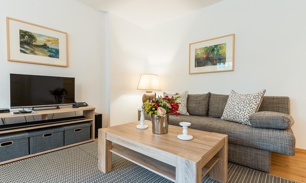 Der helle und modern eingerichtete Wohnraum verfügt über eine gemütliche Sitzecke und TV-Bereich sowie einen Esstisch am sonnigen Fensterplatz. Die Küche ist zwar klein, dafür fehlt es ihr aber nicht an Ausstattung, was jeden freuen wird, für den Kochen im Urlaub dazu gehört. Das Schlafzimmer ist mit einem Doppelbett und großzügigem Kleiderschrank ausgestattet. Abgerundet wird diese tolle Ferienwohnung mit einem großen Bad mit Dusche/WC. Gut zu wissen: Die Schlafcouch im Wohnzimmer bietet eine zusätzliche Aufbettung für eine Person.