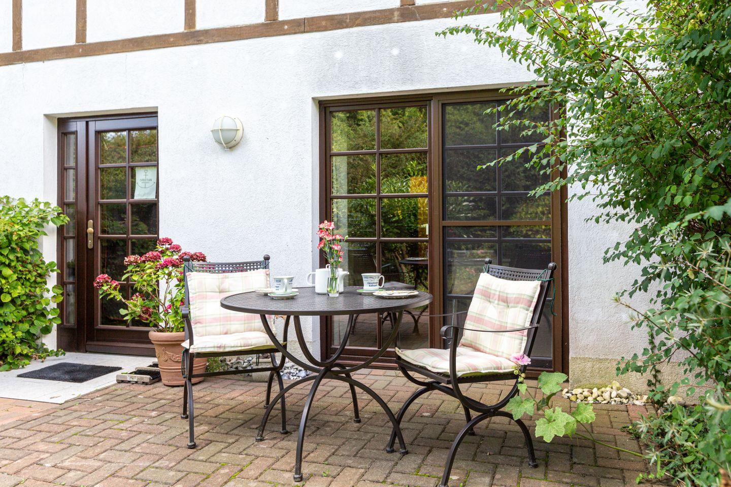 Zur Ferienwohnung gehört eine kleine Terrasse, auf der du bei einem guten Glas Wein den Tag ausklingen lassen kannst. Ein PKW-Stellplatz (gekennzeichnet mit "R") steht dir auf dem Grundstück zur Verfügung.