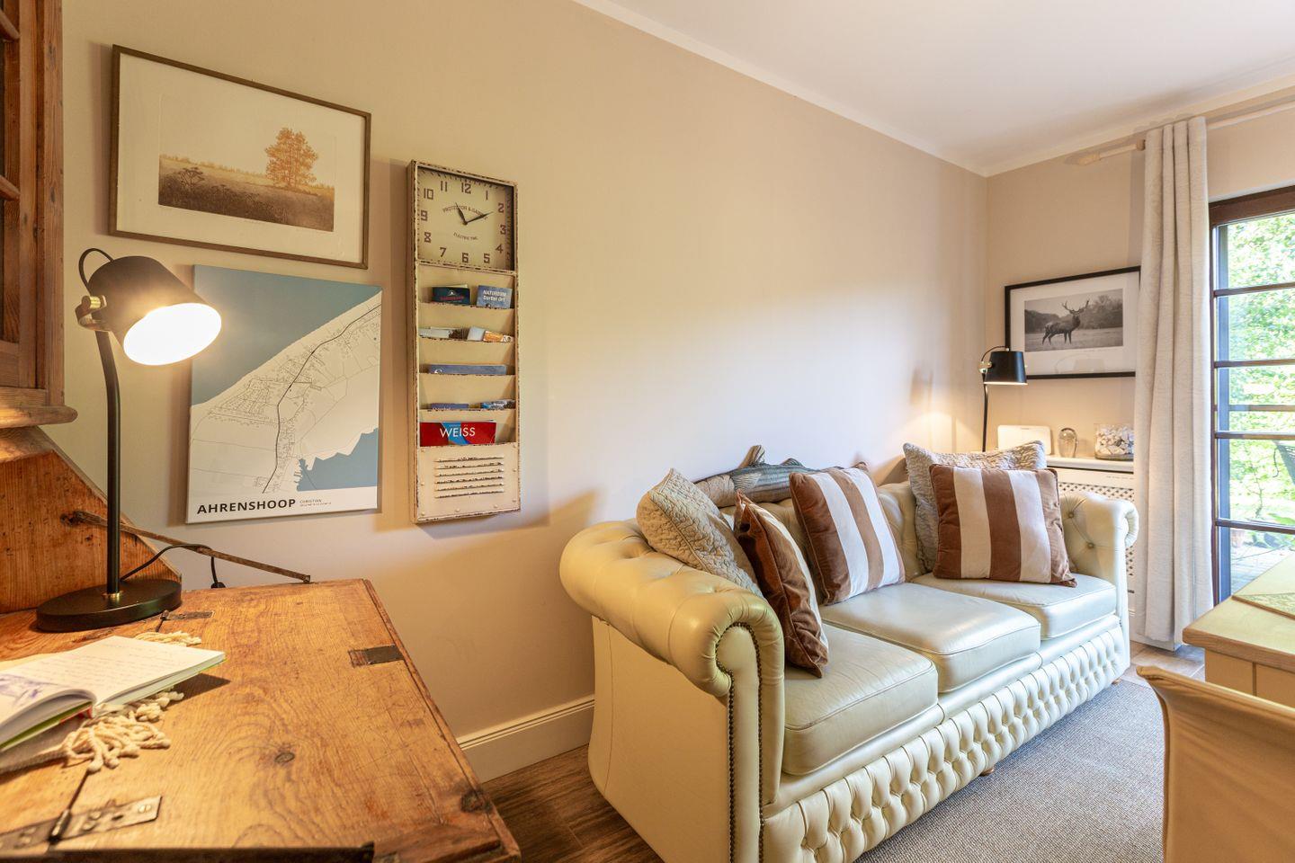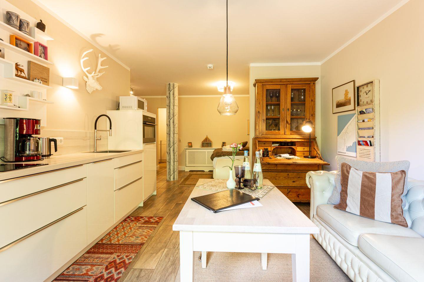 Die schicke Wohnung befindet sich im Erdgeschoss und bietet genügend Platz für zwei Personen. Liebevoll eingerichtet, begeistert die Wohnung auch mit einer in 2022 aktuellen Modernisierung. Der Wohnbereich ist das Herzstück der Ferienwohnung mit seiner modernen Sitzecke und der offenen Küchenzeile. Die Dekoelemente sind allesamt ausgewählt und passen harmonisch mit dem Interieur zusammen. Besonders ist auch die Dusche, die als halboffene, verglaste Variante in den Schlafbereich integriert wurde. Das Bad mit WC befindet sich separat. Herrlich träumen lässt es sich auch in dem Schlafbereich mit hochwertigem Boxspringbett, der optisch etwas abgetrennt vom Wohnbereich ist. In Holzdielenoptik aber gefliest bietet der Boden zudem einen sehr wertigen Belag.