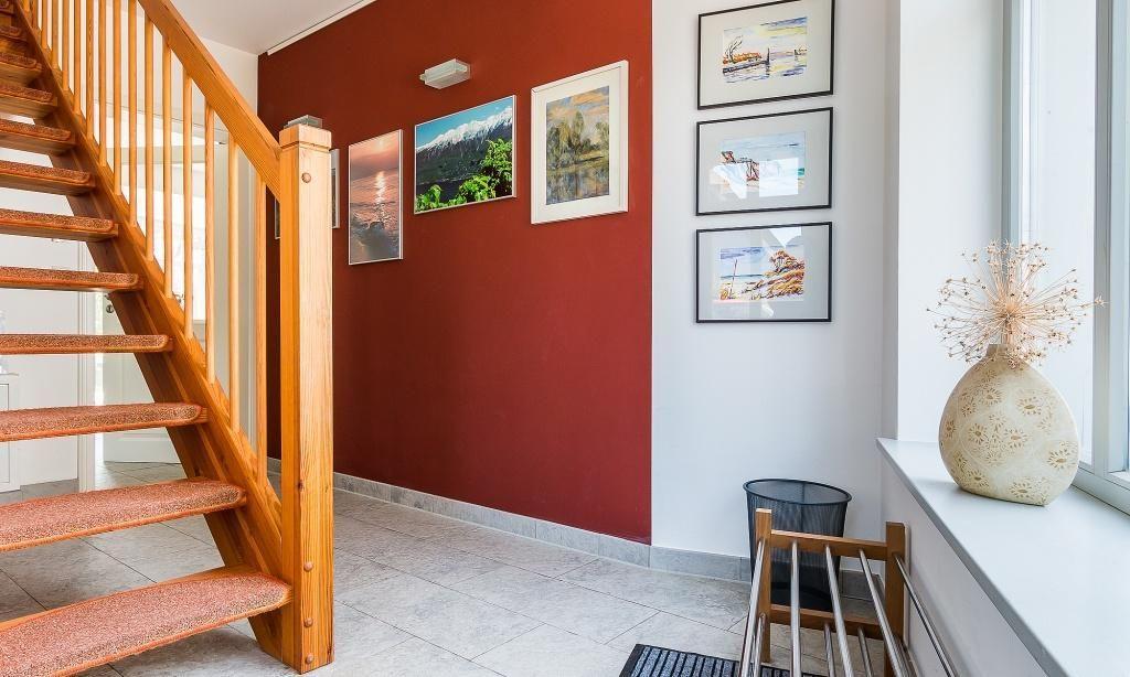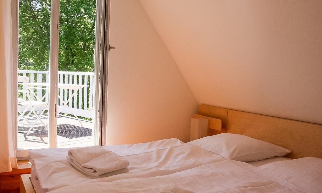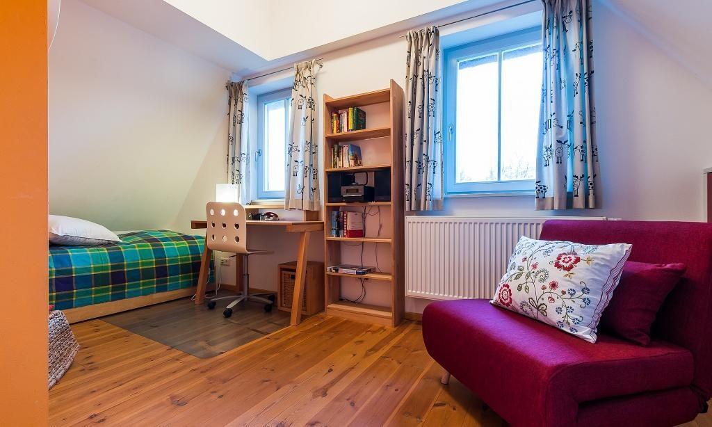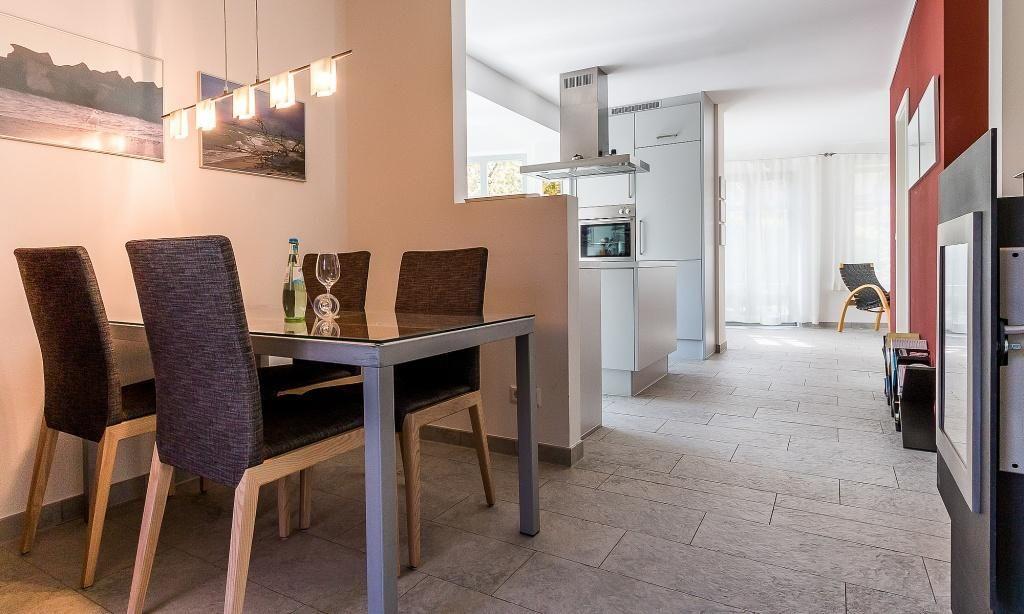 Im Erdgeschoss befinden sich ein gemütlicher Wohnbereich mit Blick ins Grüne, ein Essbereich direkt am Kamin, eine komfortable Küchenzeile mit Kochinsel, ein Bad mit Dusche/WC sowie ein abgeschlossener Eingangsbereich mit Garderobe und Treppe ins Dachgeschoss. Das Dachgeschoss verfügt über ein Schlafzimmer mit einem Doppelbett und direktem Zutritt auf den Westbalkon sowie ein zweiten Schlafraum mit Schreibtisch, einem Einzelbett sowie einem Schlafsessel, der zur Liege umfunktioniert und somit als Aufbettung für eine vierte Person genutzt werden kann. Auch ein zweites Badezimmer mit Badewanne/WC befindet sich im Obergeschoss.