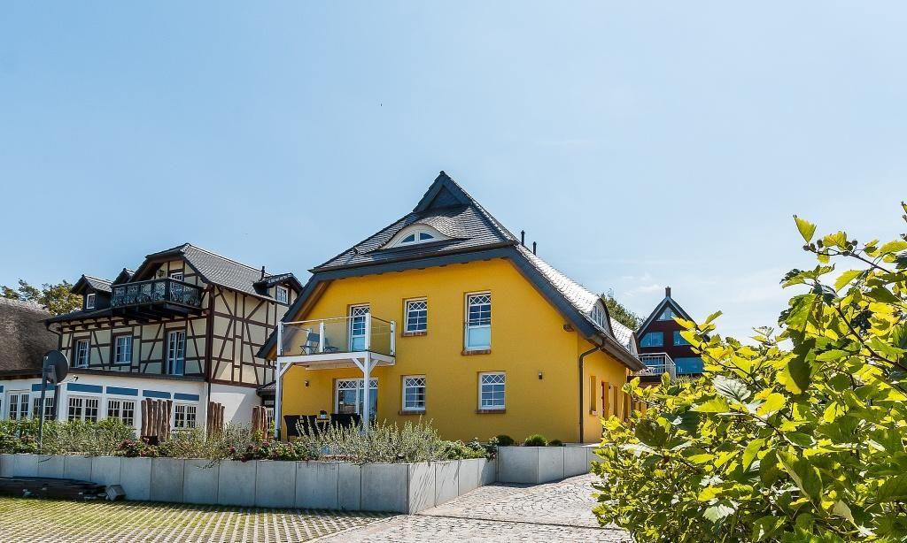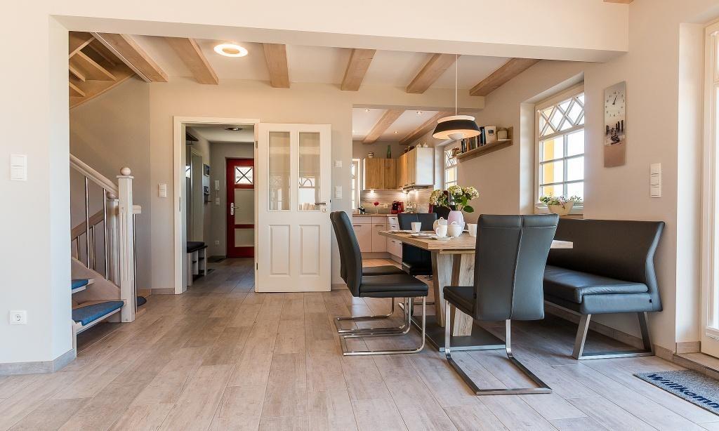 Diese großzügige Haushälfte mit 160 m² verspricht mit seiner maritim-modernen Ausstattung absoluten Wohnkomfort. Durch die Darßer Haustür und über den einladenden Eingangsbereich mit Garderobe gelangst du direkt in den weitläufigen und freundlichen Wohnraum. Hier erwartet dich eine gemütlichen Sitzecke direkt am großen Kamin. Dieser wird mit Gas betrieben und kann jederzeit mittels einer Fernbedienung in Betrieb genommen werden - erholsame Stunden werden dir so bequem per Knopfdruck beschert. Oder du lässt dich über den extragroßen TV unterhalten. Die offene Küchenzeile mit Essbereich fügt sich harmonisch in den Wohnbereich ein. In der unteren Etage befindet sich weiterhin ein Gäste-Bad mit Dusche/WC.