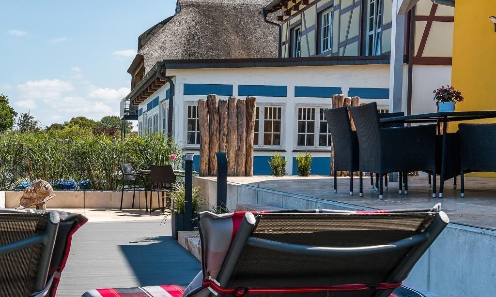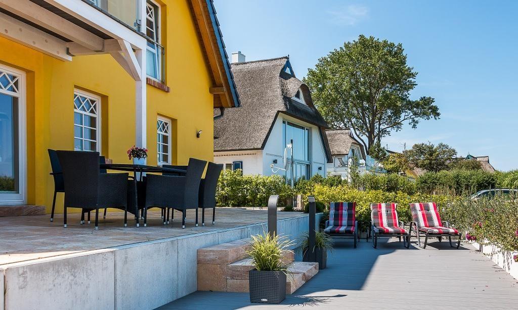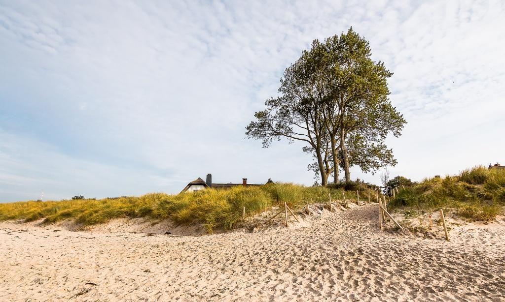 Der Außenbereich begeistert mit drei großzügigen Terrassen mit herrlichem Blick auf die Dünenlandschaft der Ostseeküste. Die hochwertige Ausstattung beinhaltet ausreichend Sonnenliegen, Sonnenschirme, gemütliche Gartenmöbel und moderne Bodenstrahler. Genieße hier dein Frühstück am Morgen oder relaxe tagsüber und am Abend mit einem Buch oder einem guten Glas Wein. Zum Ferienhaus gehören außerdem zwei PKW-Stellplätze. Ein weiteres Highlight ist der hauseigene Strandkorb, der dir vor allem in der warmen Jahreszeit ein schattiges Plätzchen auf der Terrasse bietet.